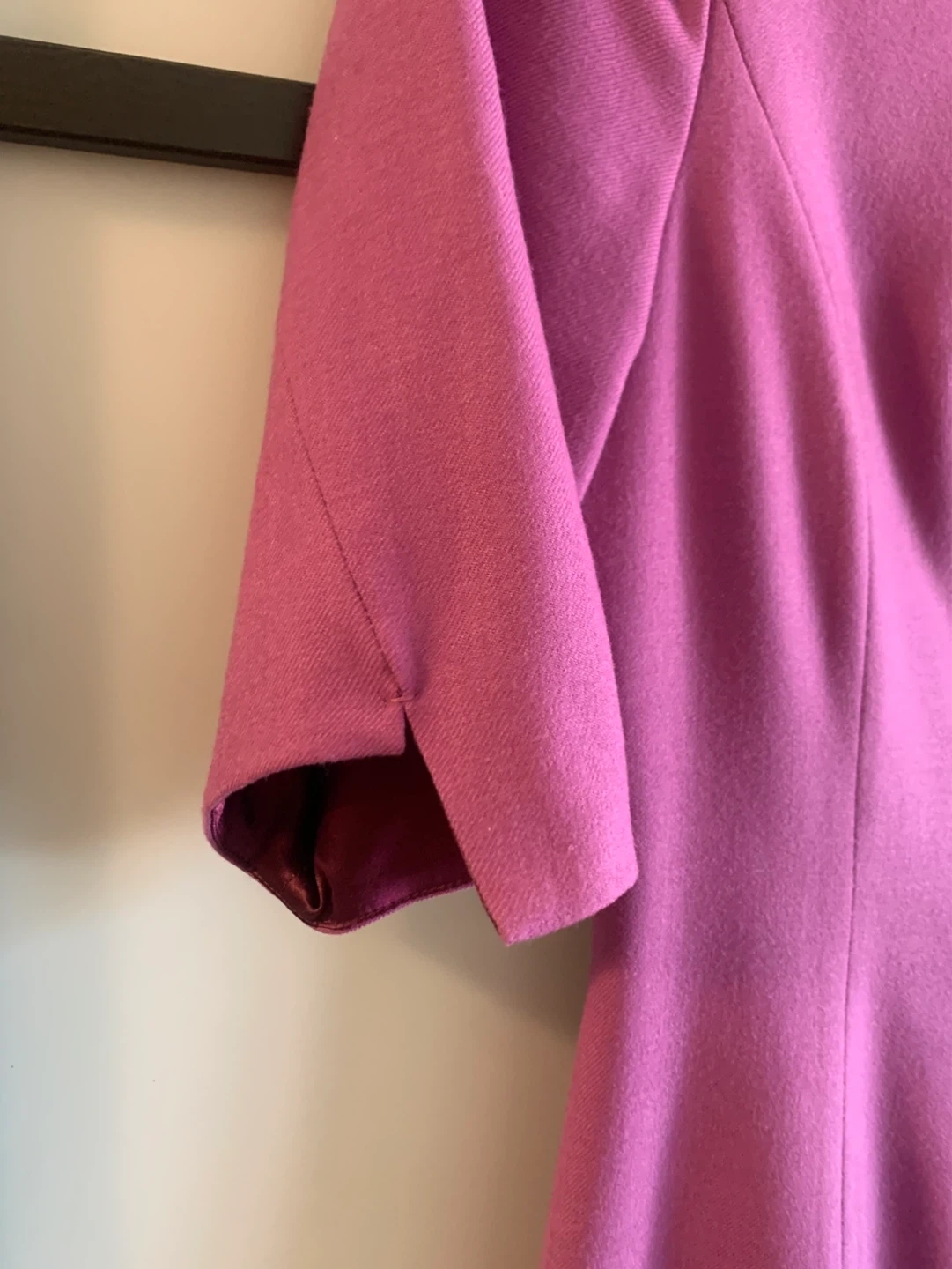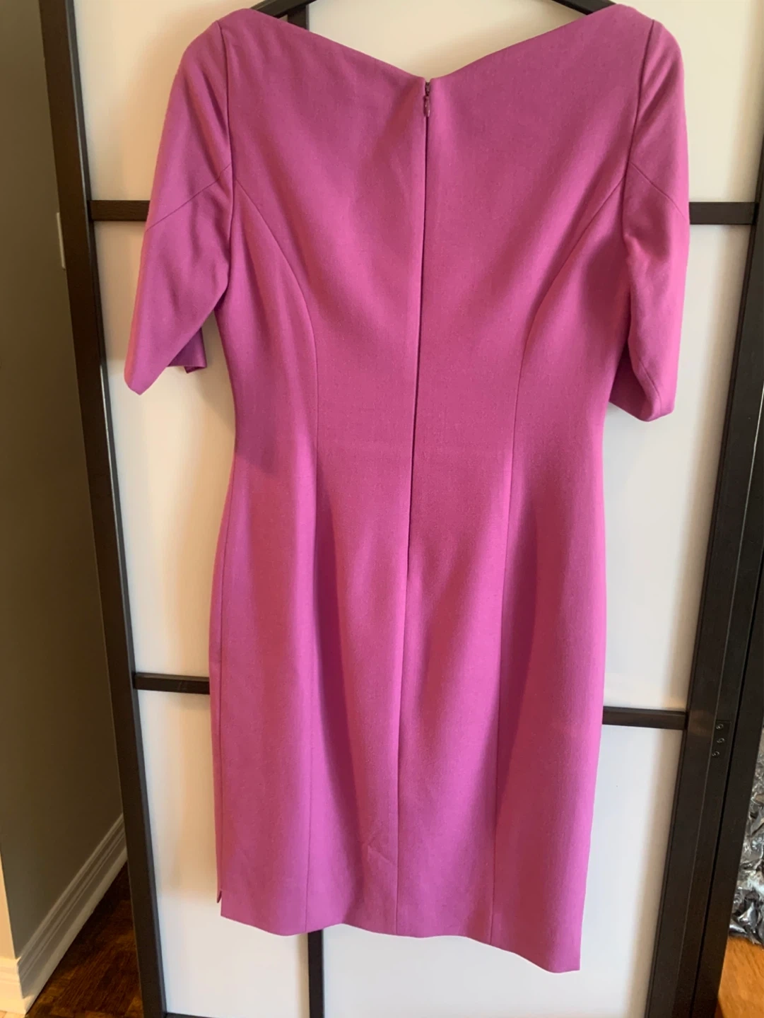 A chic pink sheath dress from Elie Tahari. It features a flattering square neckline and 3/4 sleeves. Fully lined with a back zipper closure.