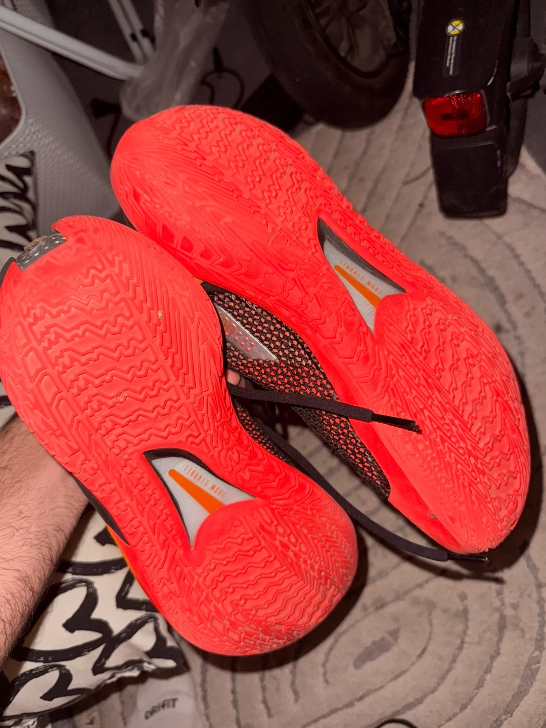 These Nike Air Zoom GT Cut 2 basketball shoes are black with orange accents. They feature a rubber outsole for traction. Great for playing basketball!