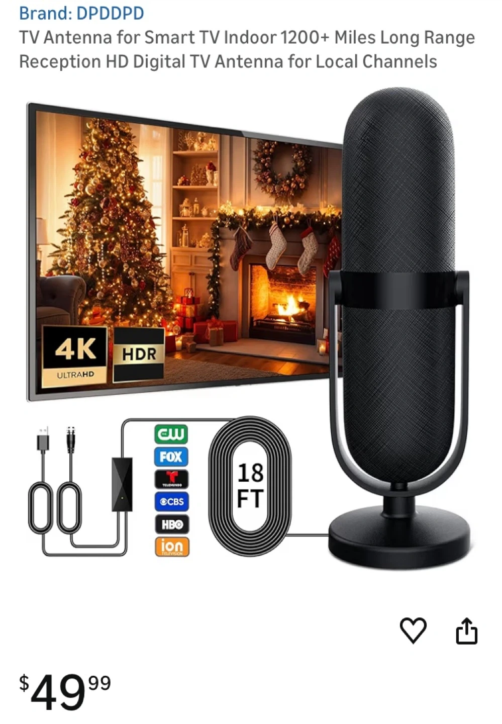 DPDDPD indoor TV antenna designed for smart TVs. It offers over 1200 miles of long-range reception for local HD digital channels. This antenna comes with an 18 ft cable. It's compatible with major networks like CW, FOX, Telemundo, CBS, HBO, and ION.