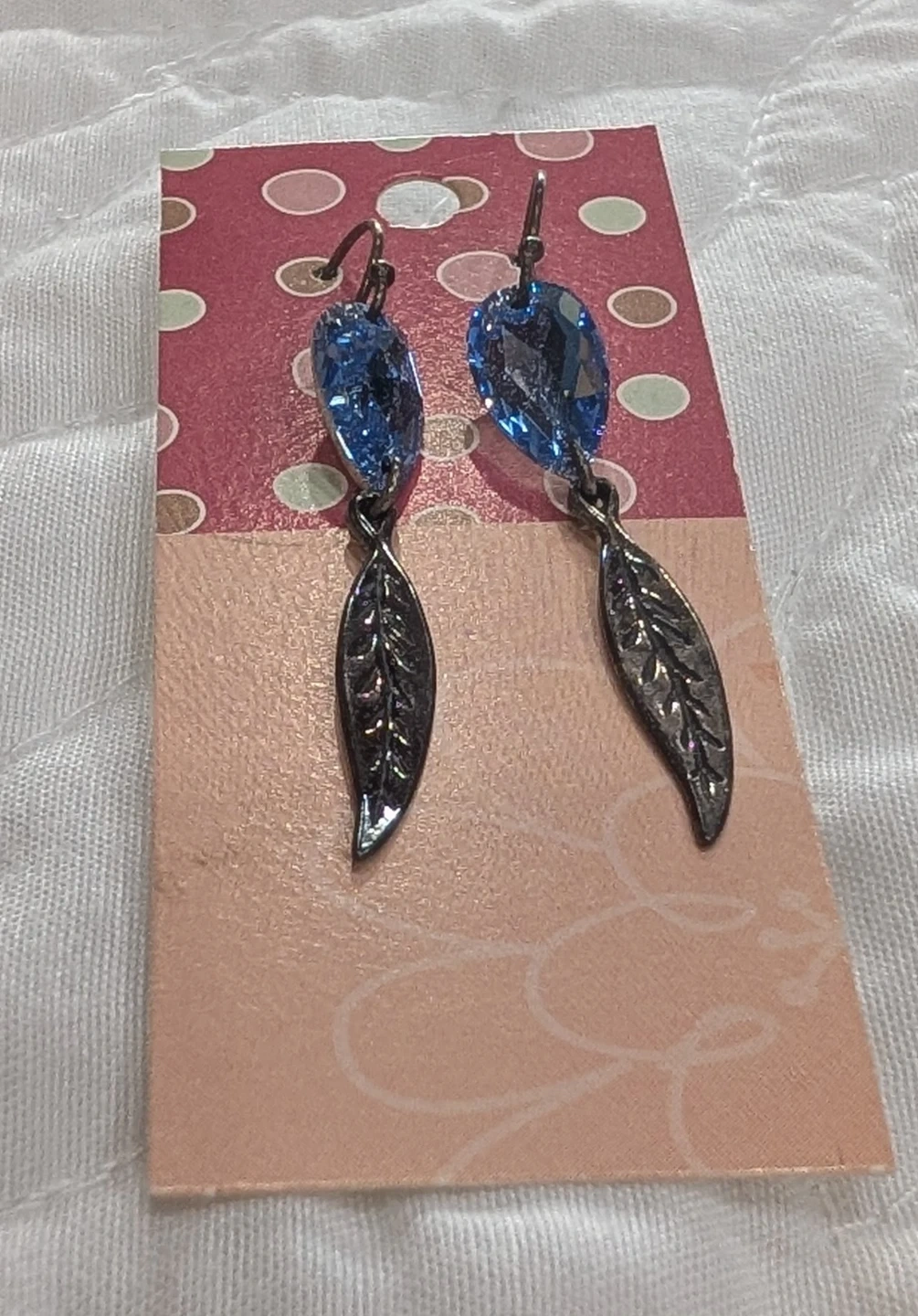 Helping my grandma sell these cute pair of earrings with blue crystal and leaf design. They are in great condition!