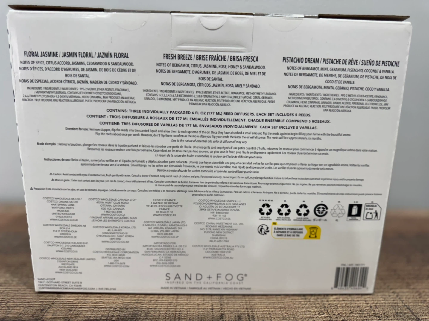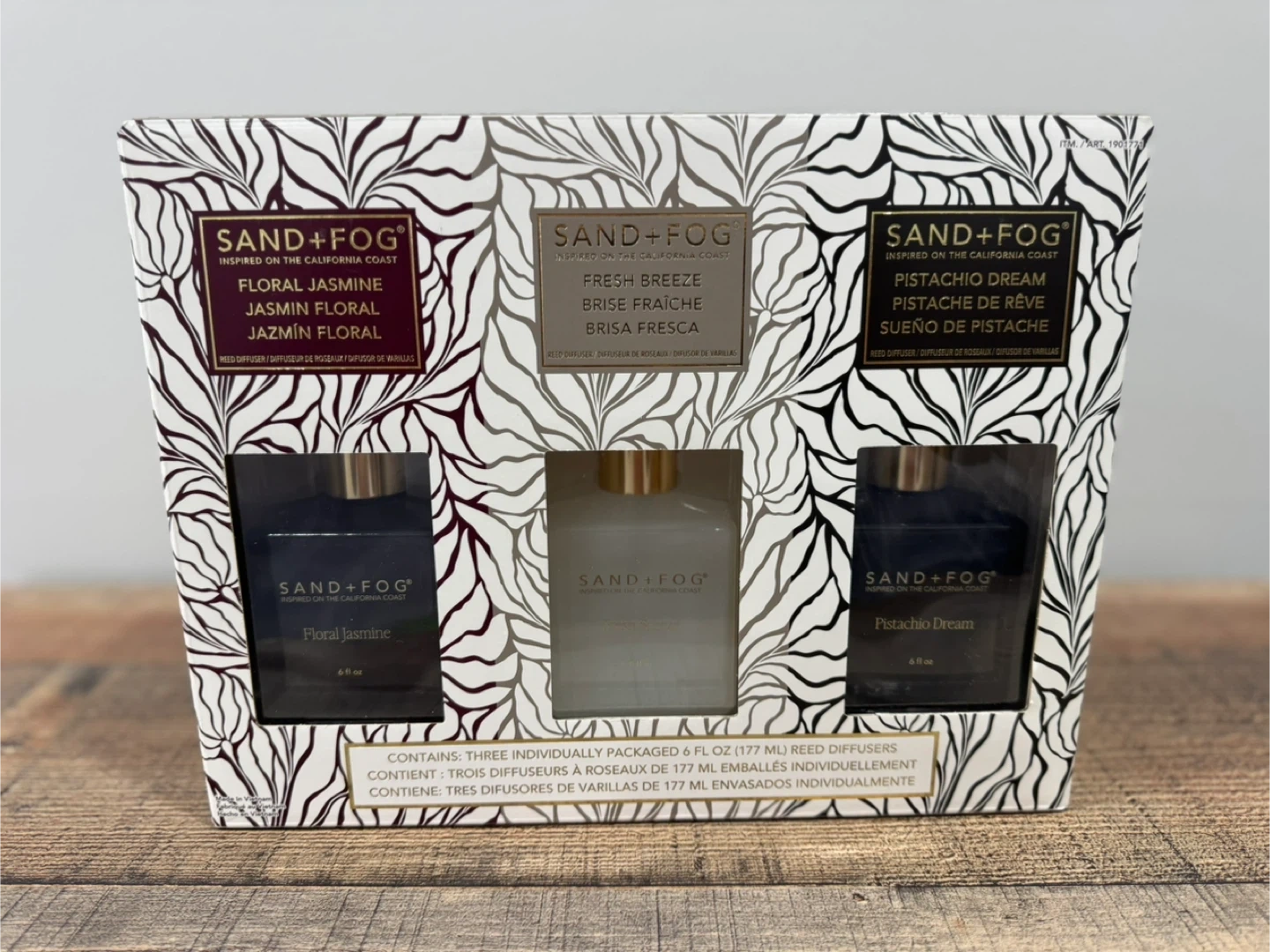 This Sand + Fog reed diffuser set includes three individual 6 fl oz (177 ml) diffusers. The scents are Floral Jasmine, Fresh Breeze, and Pistachio Dream. Each set contains three reeds.