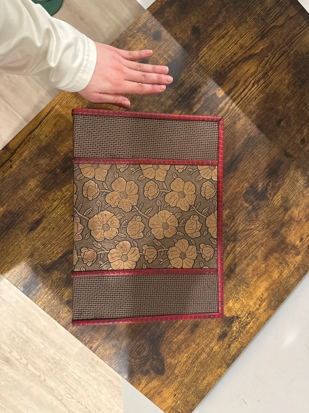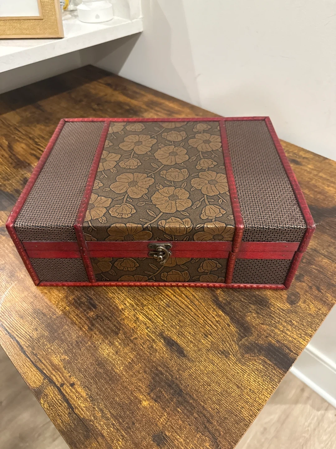 This decorative box features a beautiful floral pattern with red trim. It's made of wood and has metal clasps for closure. Perfect for storing small treasures or keepsakes!