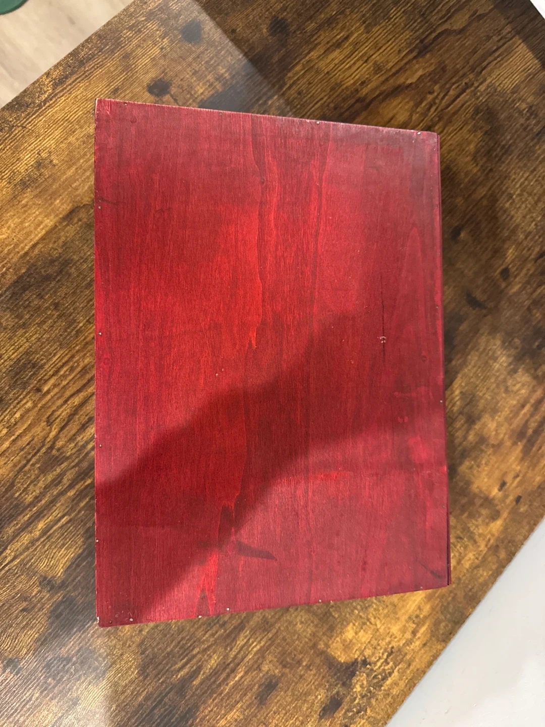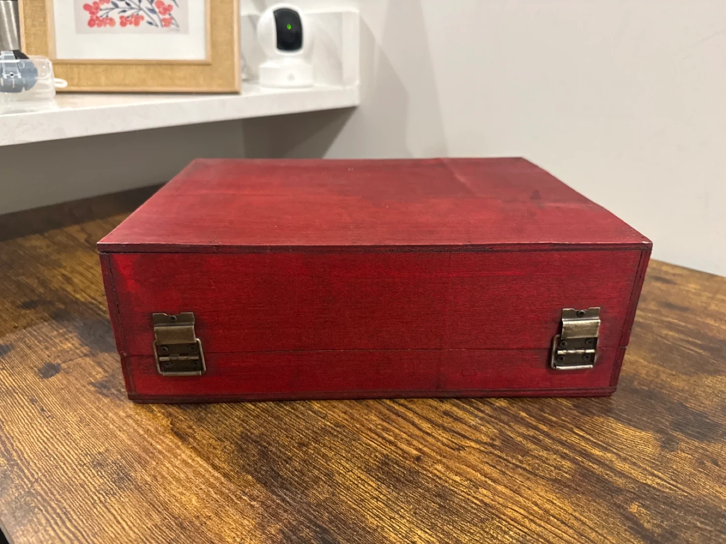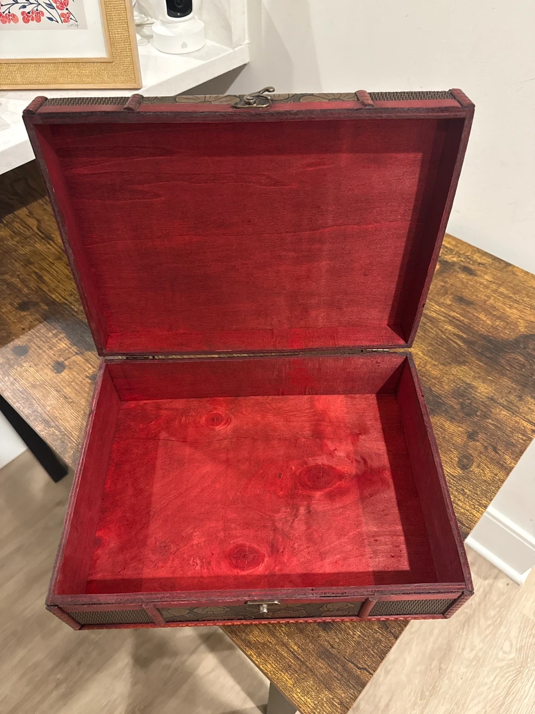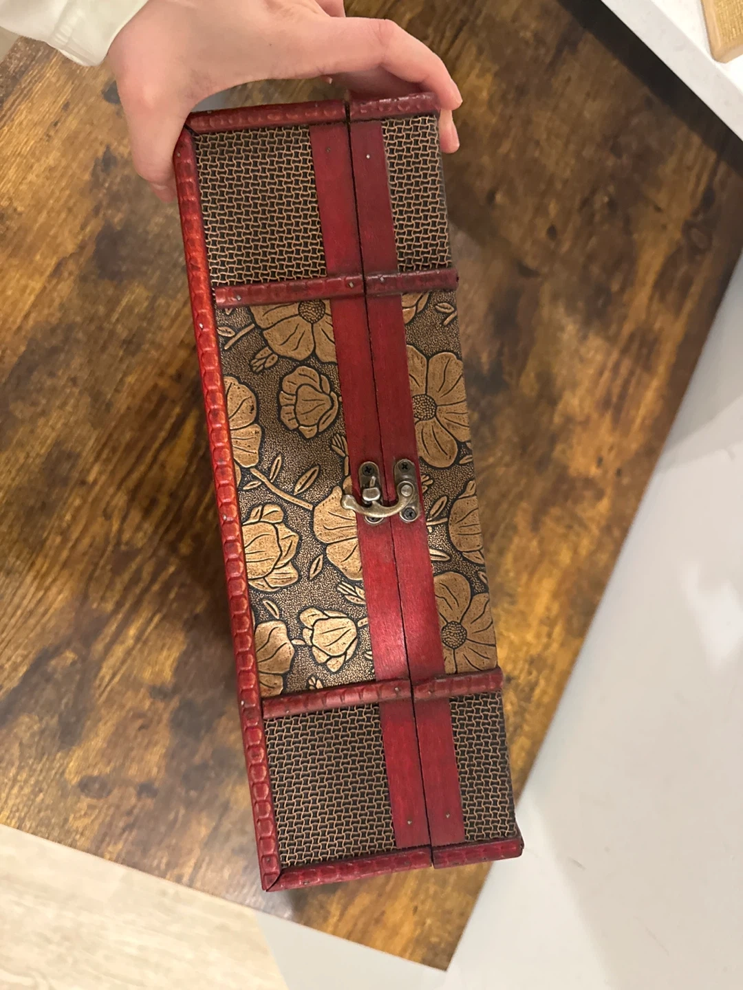 This decorative box features a beautiful floral pattern with red trim. It's made of wood and has metal clasps for closure. Perfect for storing small treasures or keepsakes!