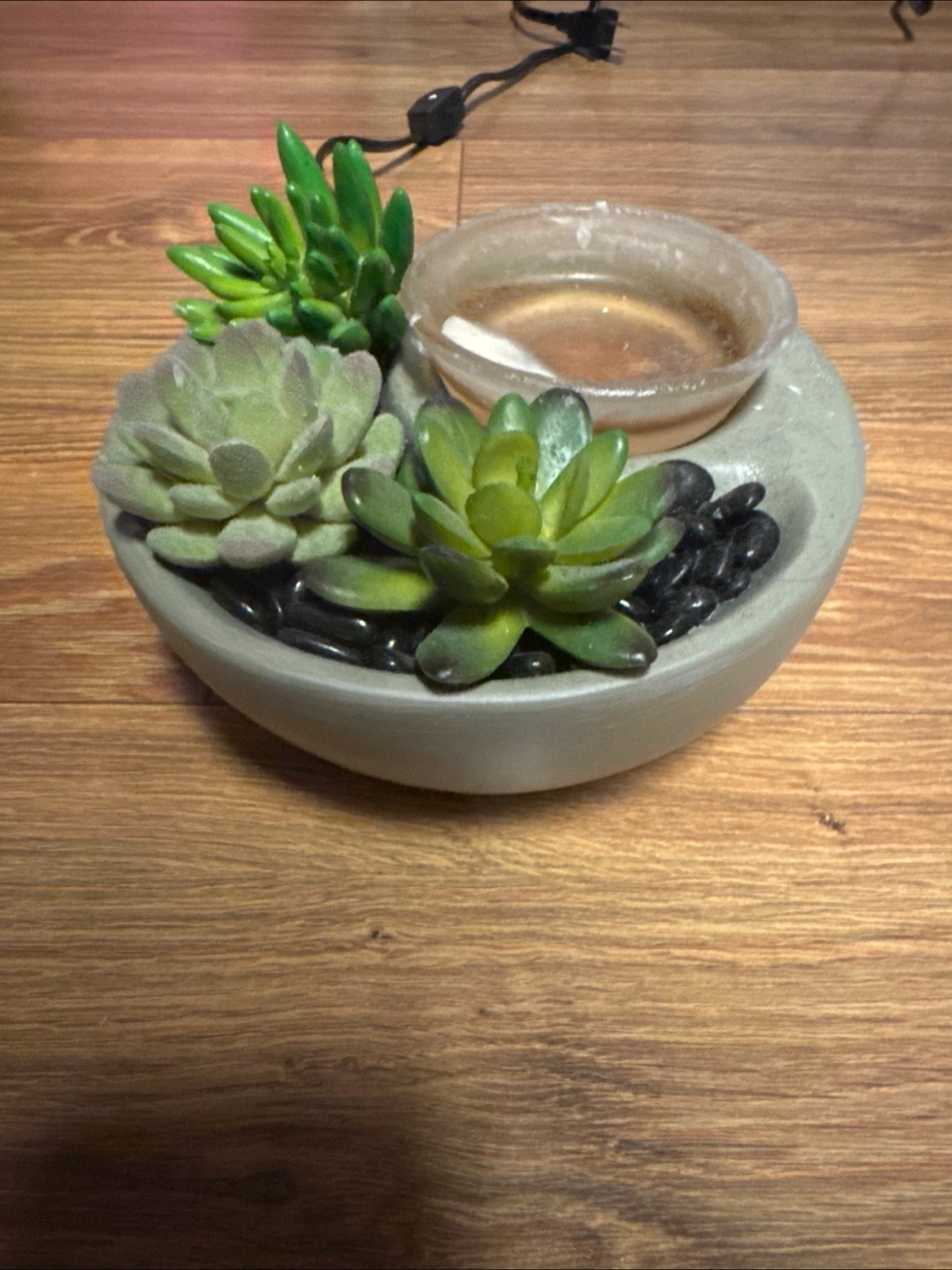 Electric wax warmer. Features a bowl for wax melts and decorative succulents. Includes black decorative stones. It retails at $55, i will clean it nice before pickup! ❤️