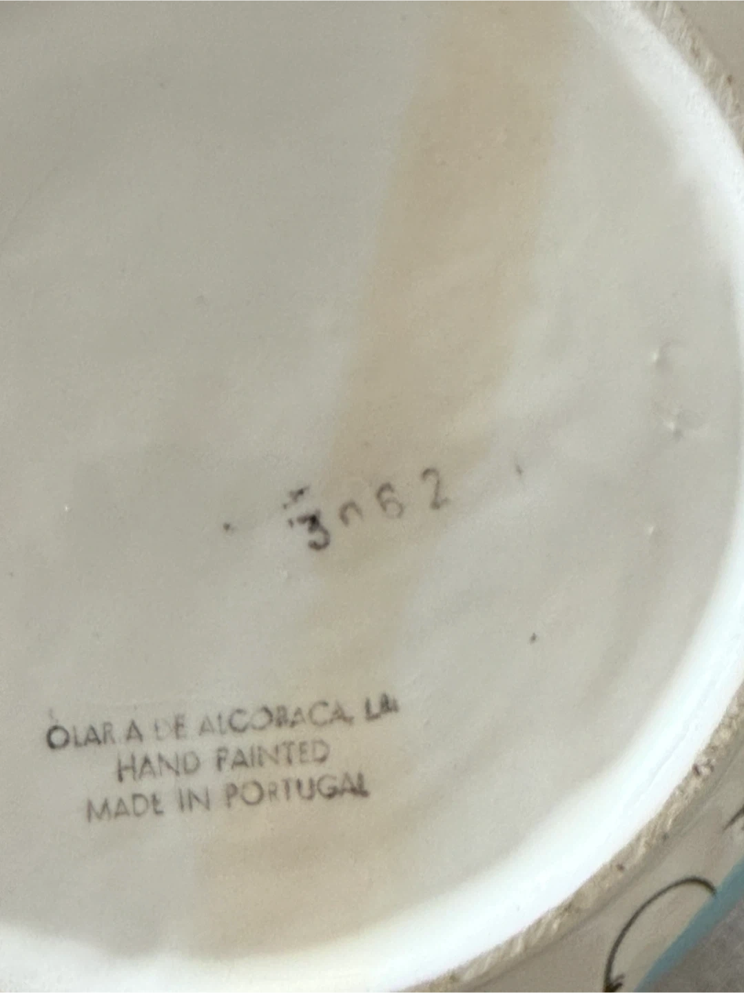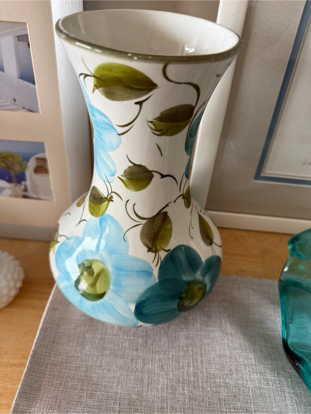 This is a beautiful hand-painted vase from Portugal. It features a floral design with blue and green accents on a white background. It's perfect for adding a touch of elegance to any room!