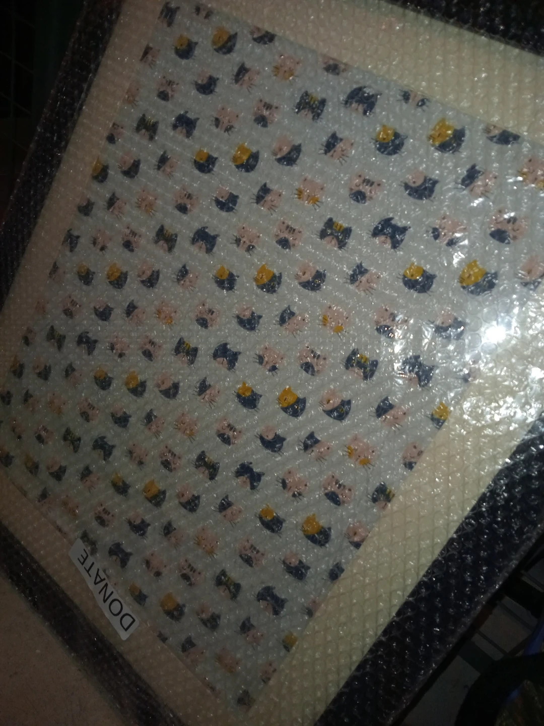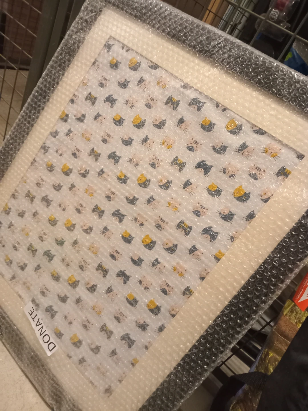 Framed artwork featuring a repeated pattern of cute cats. It's ready to hang and would add a playful touch to any room. The print is behind glass with a neutral matting and a black frame.
