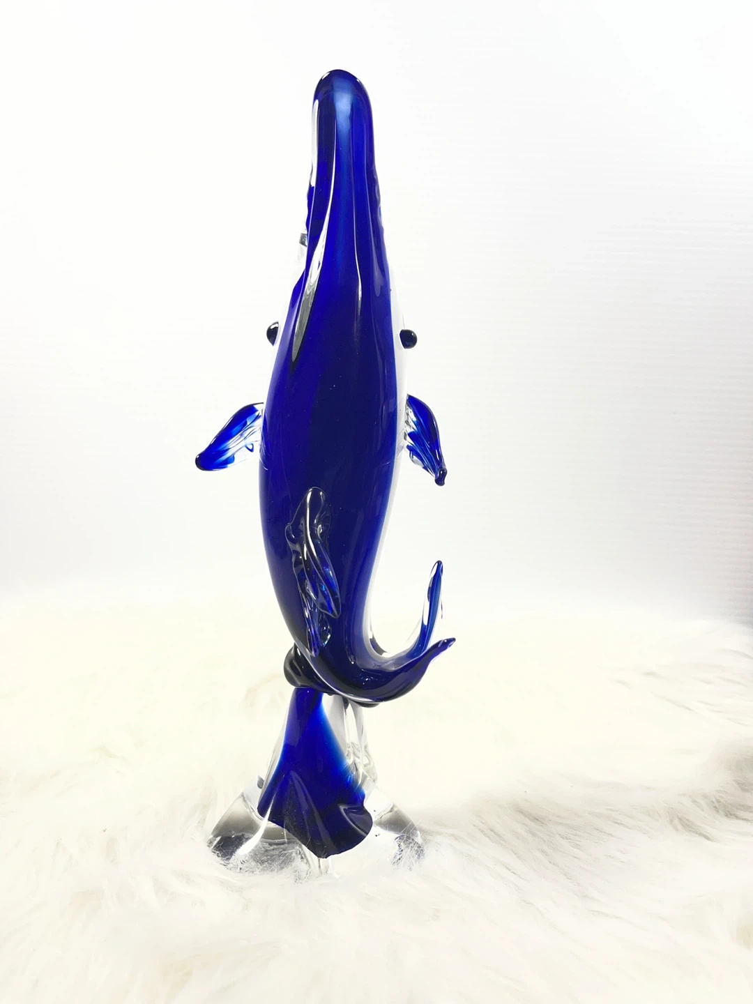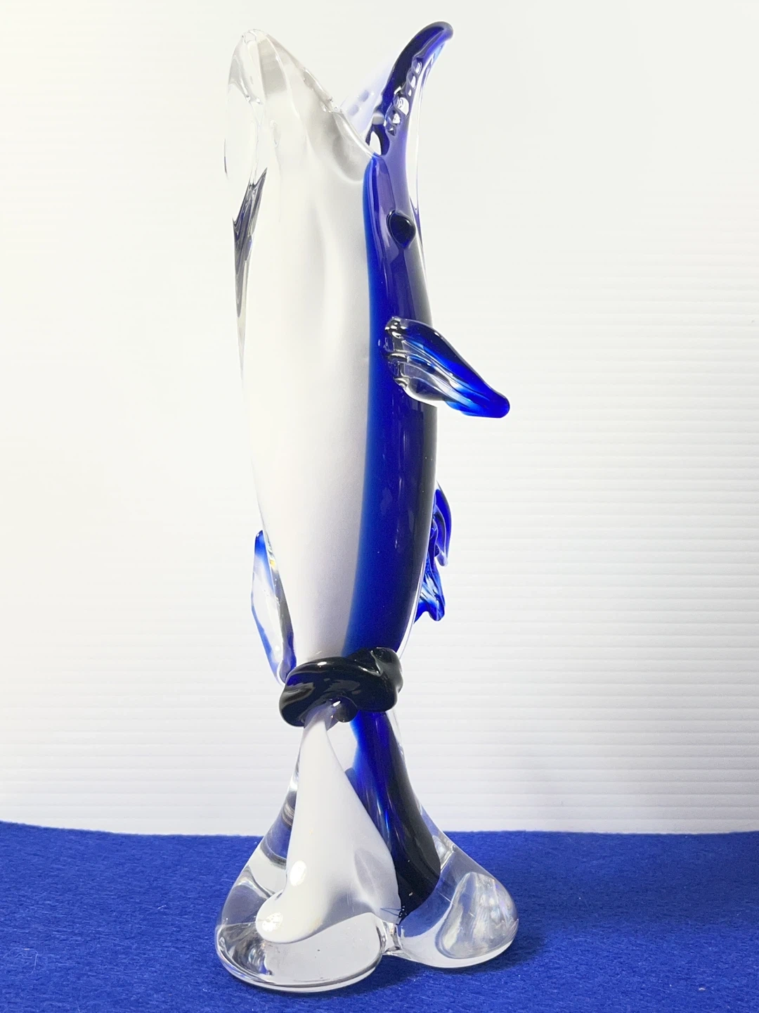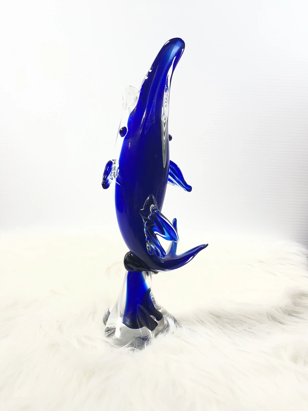 This isn't your average small figurine—standing at a substantial 11 inches tall, this hand-blown art glass dolphin features a deep, vibrant cobalt blue core encased in thick, crystal-clear glass using the classic Sommerso technique.