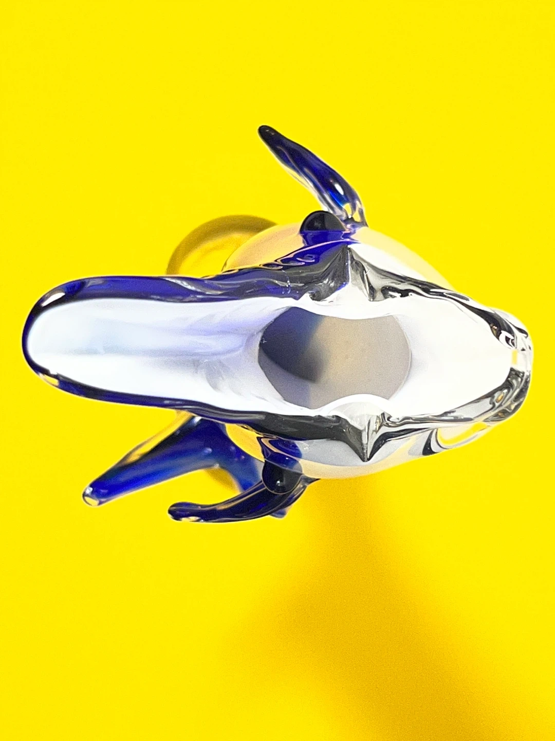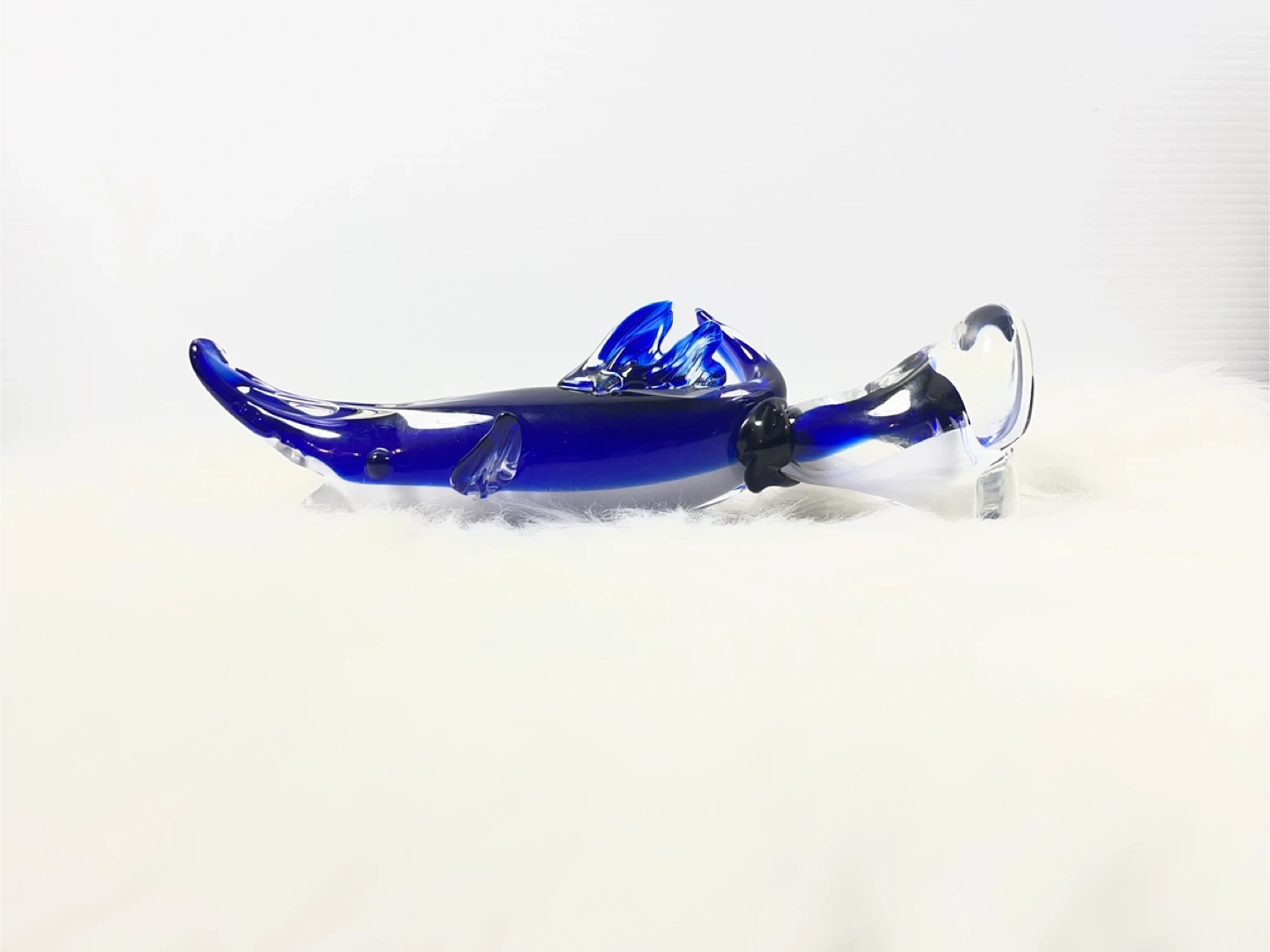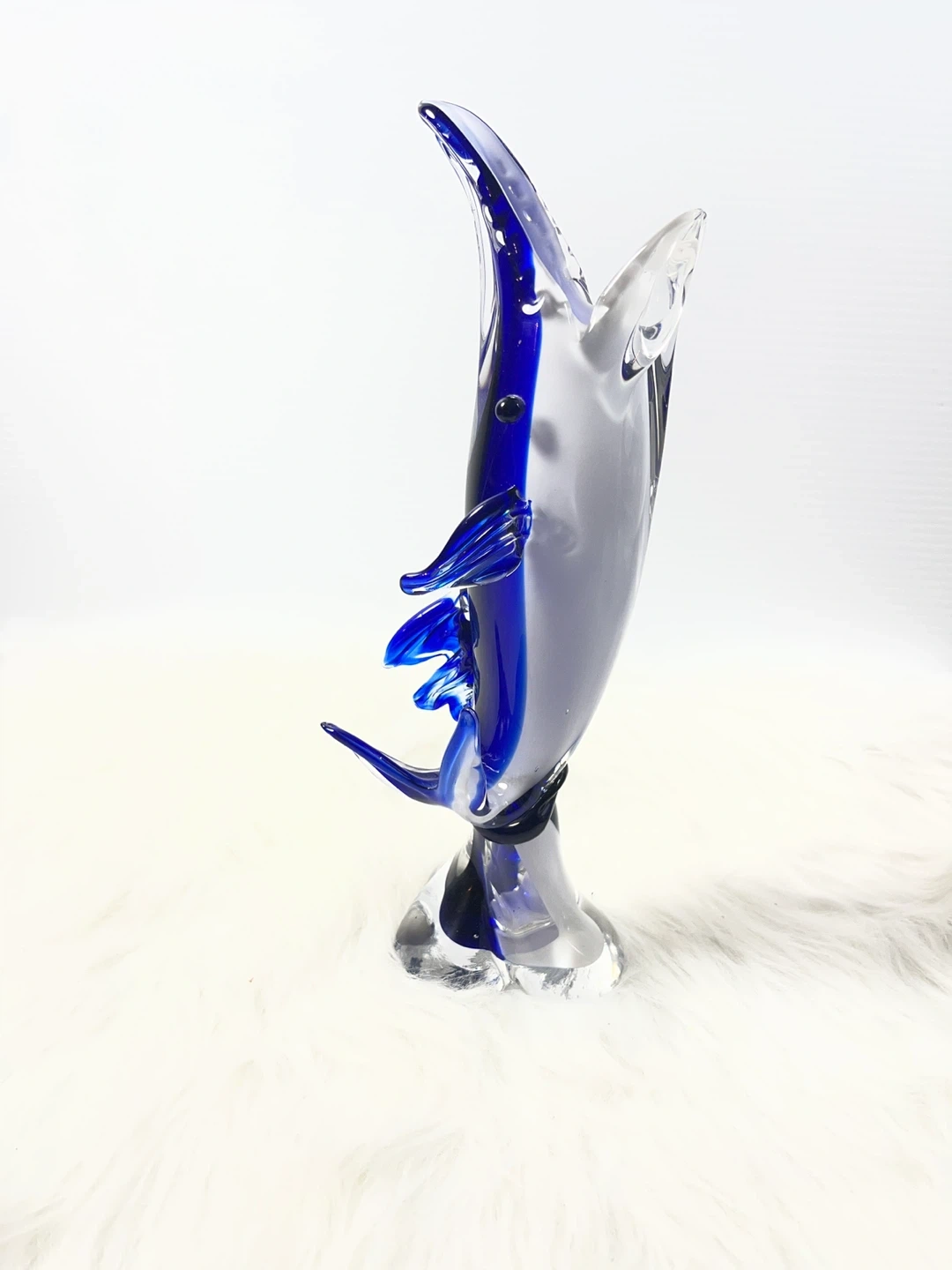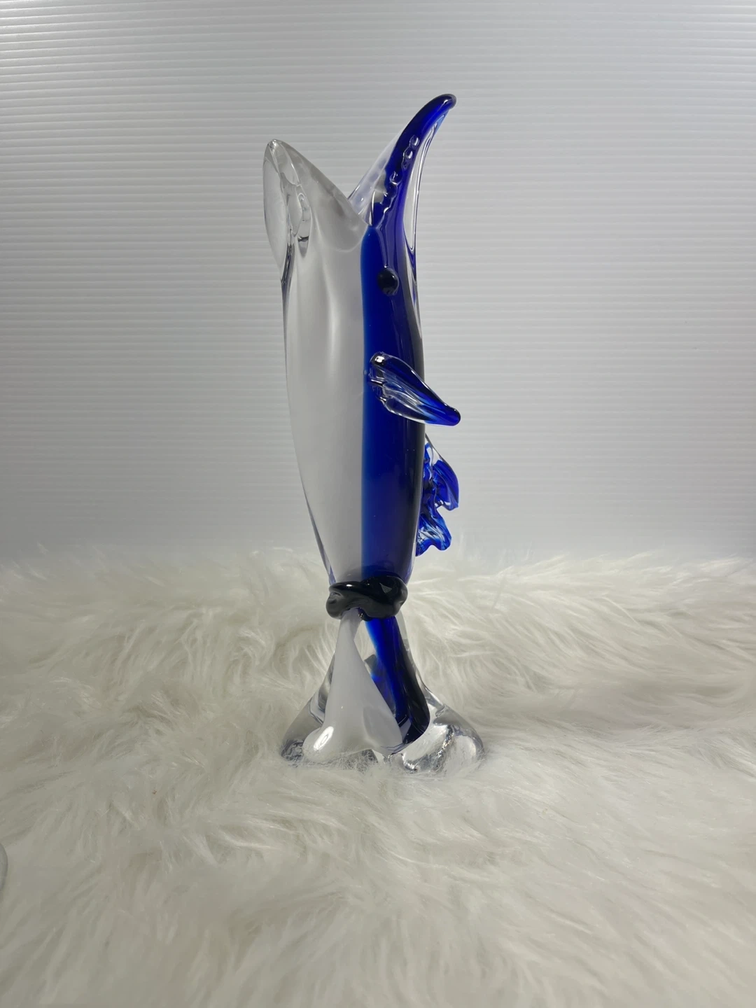 This isn't your average small figurine—standing at a substantial 11 inches tall, this hand-blown art glass dolphin features a deep, vibrant cobalt blue core encased in thick, crystal-clear glass using the classic Sommerso technique.