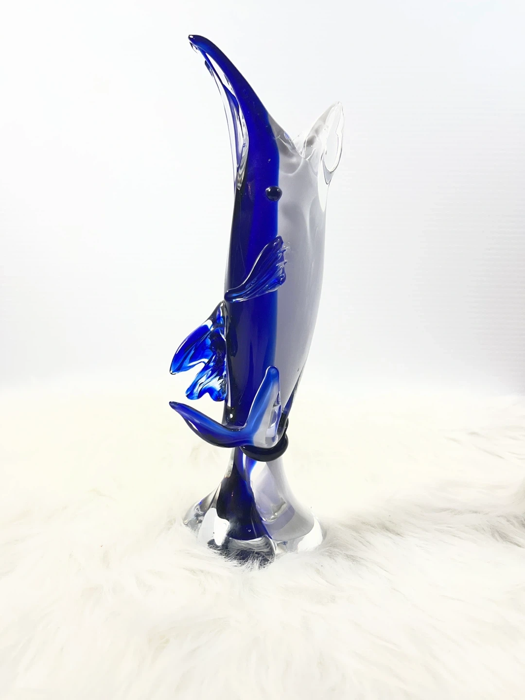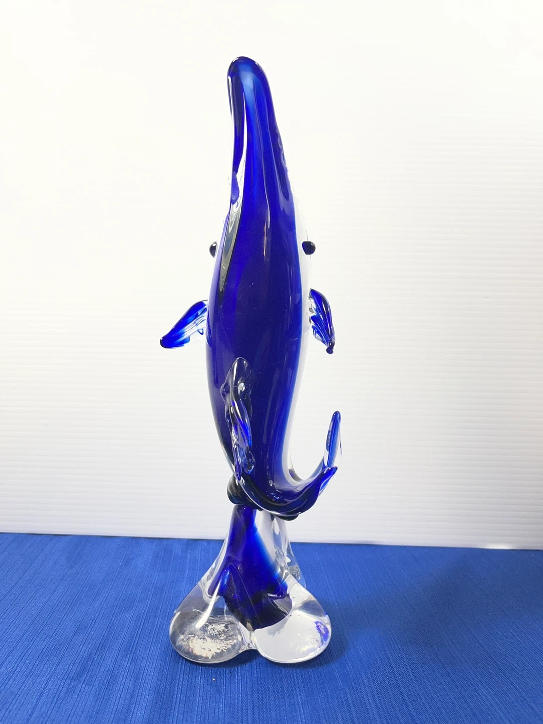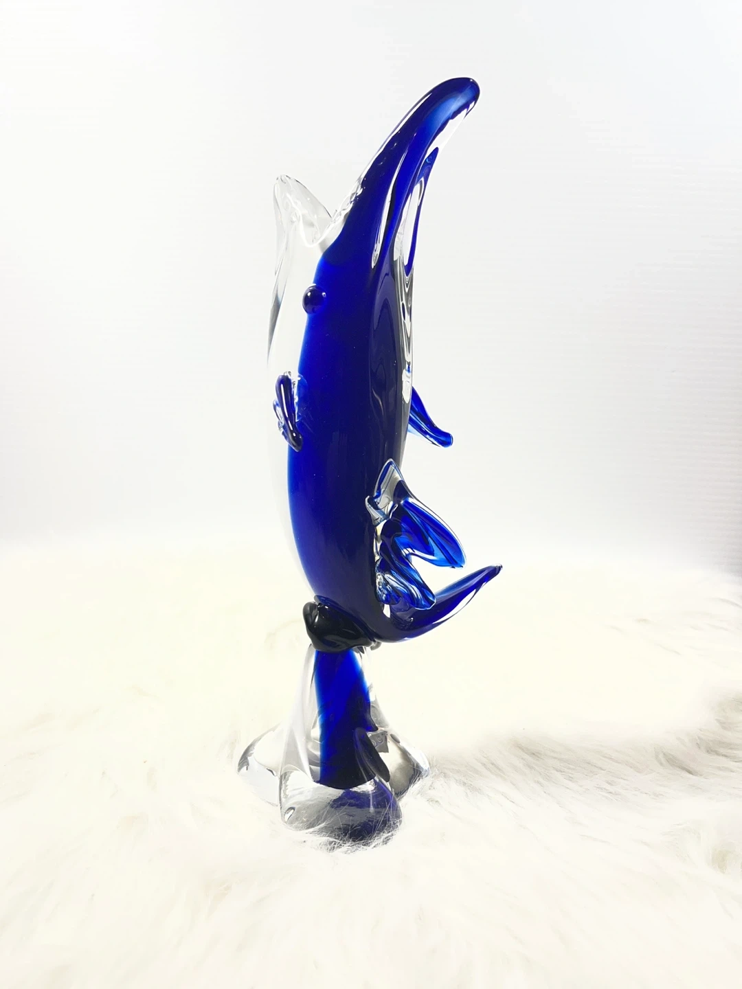 This isn't your average small figurine—standing at a substantial 11 inches tall, this hand-blown art glass dolphin features a deep, vibrant cobalt blue core encased in thick, crystal-clear glass using the classic Sommerso technique.
