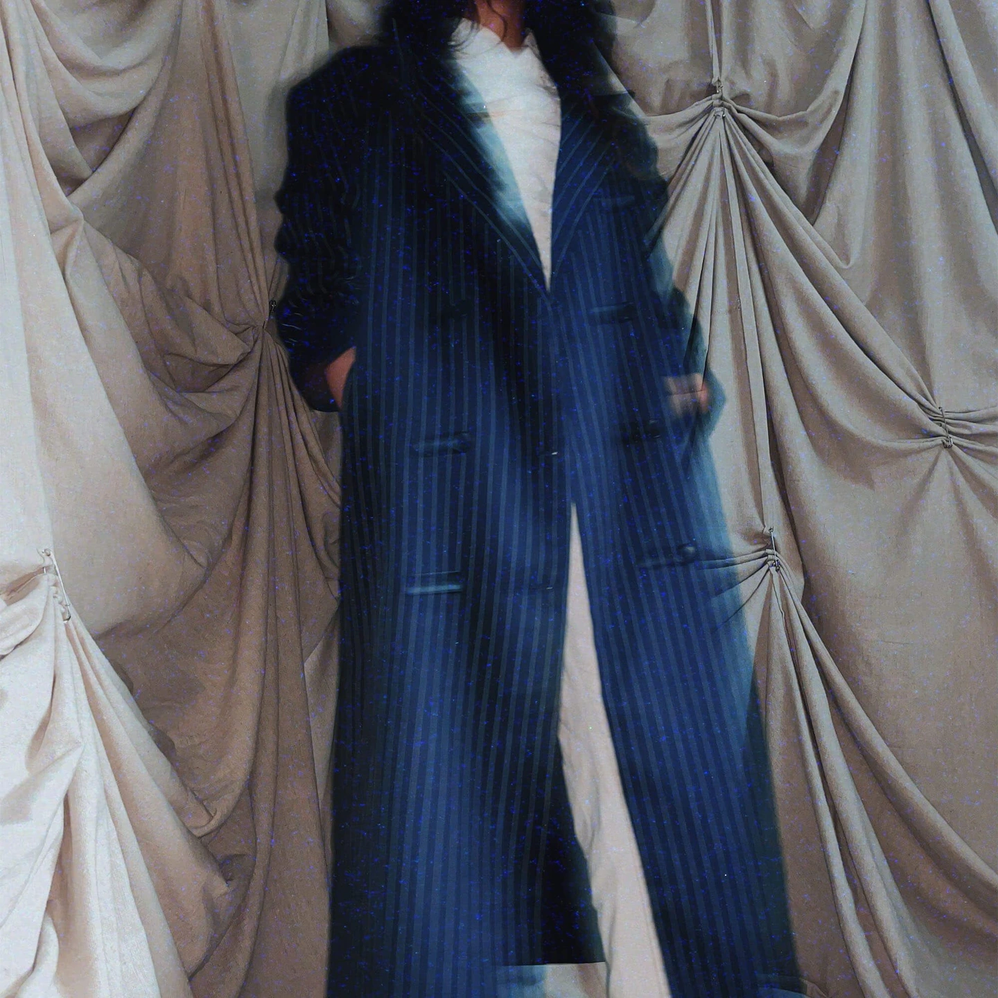 long maxi navy blue pinstripe coat, boxy jacket outerwear