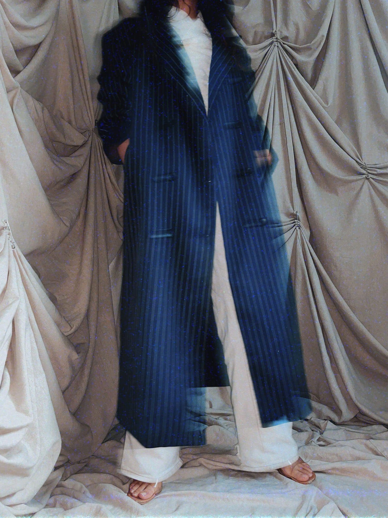 long maxi navy blue pinstripe coat, boxy jacket outerwear