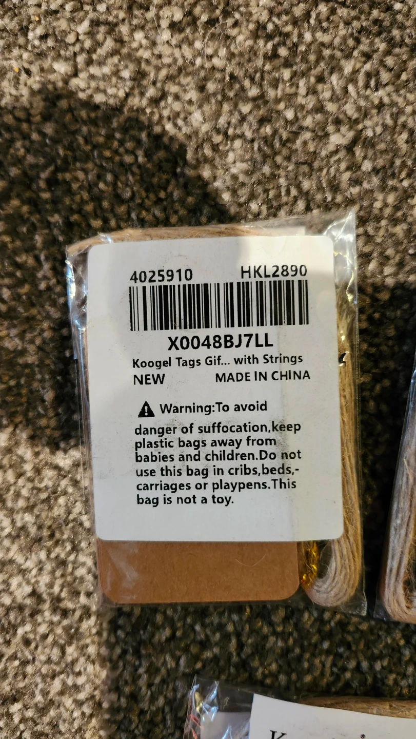Five packs of Koogel gift tags. Each tag is made of kraft paper and comes with a string for attachment. Perfect for labelling gifts or crafts! Each pack has at least 20 tags