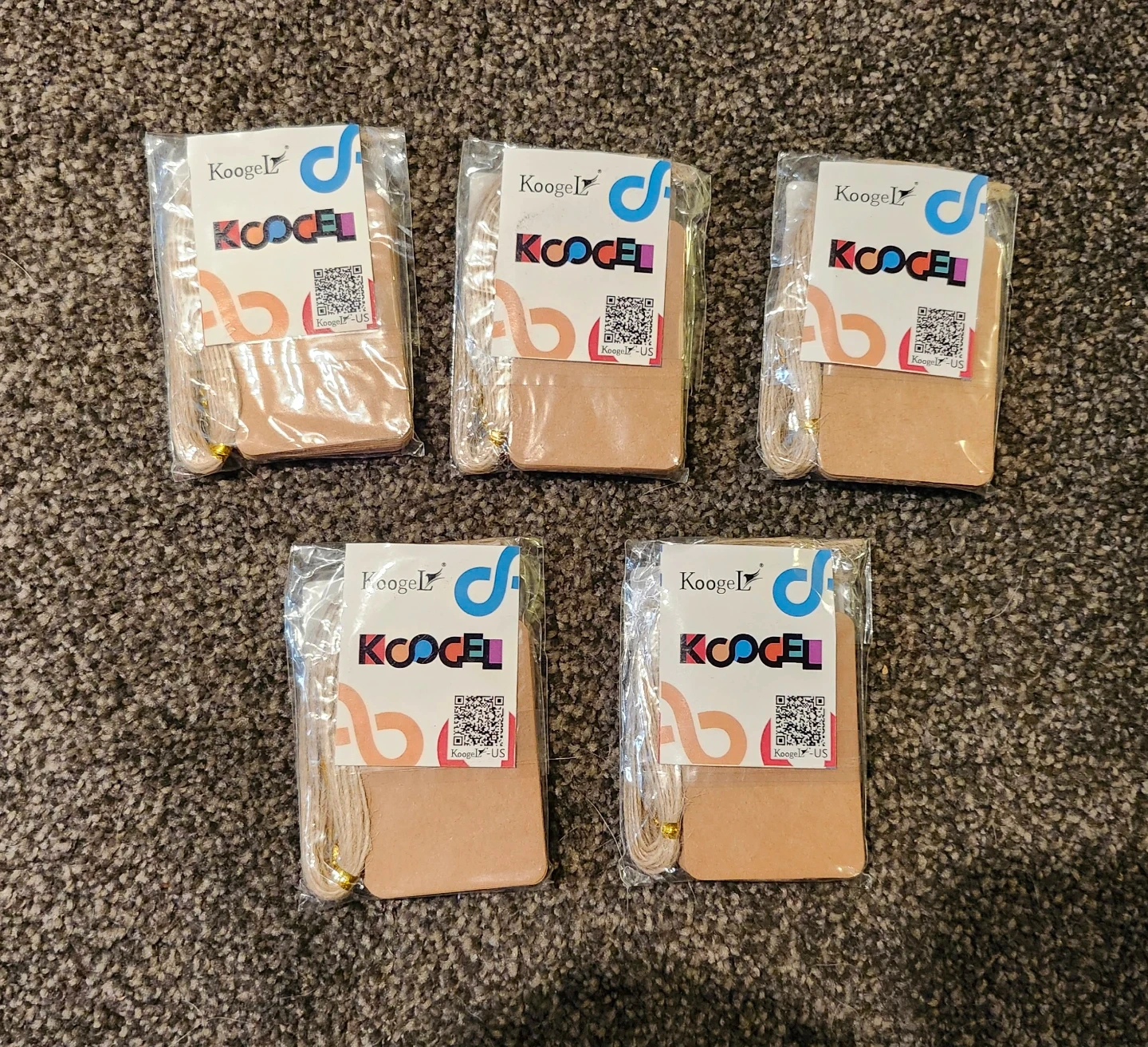 Five packs of Koogel gift tags. Each tag is made of kraft paper and comes with a string for attachment. Perfect for labelling gifts or crafts! Each pack has at least 20 tags
