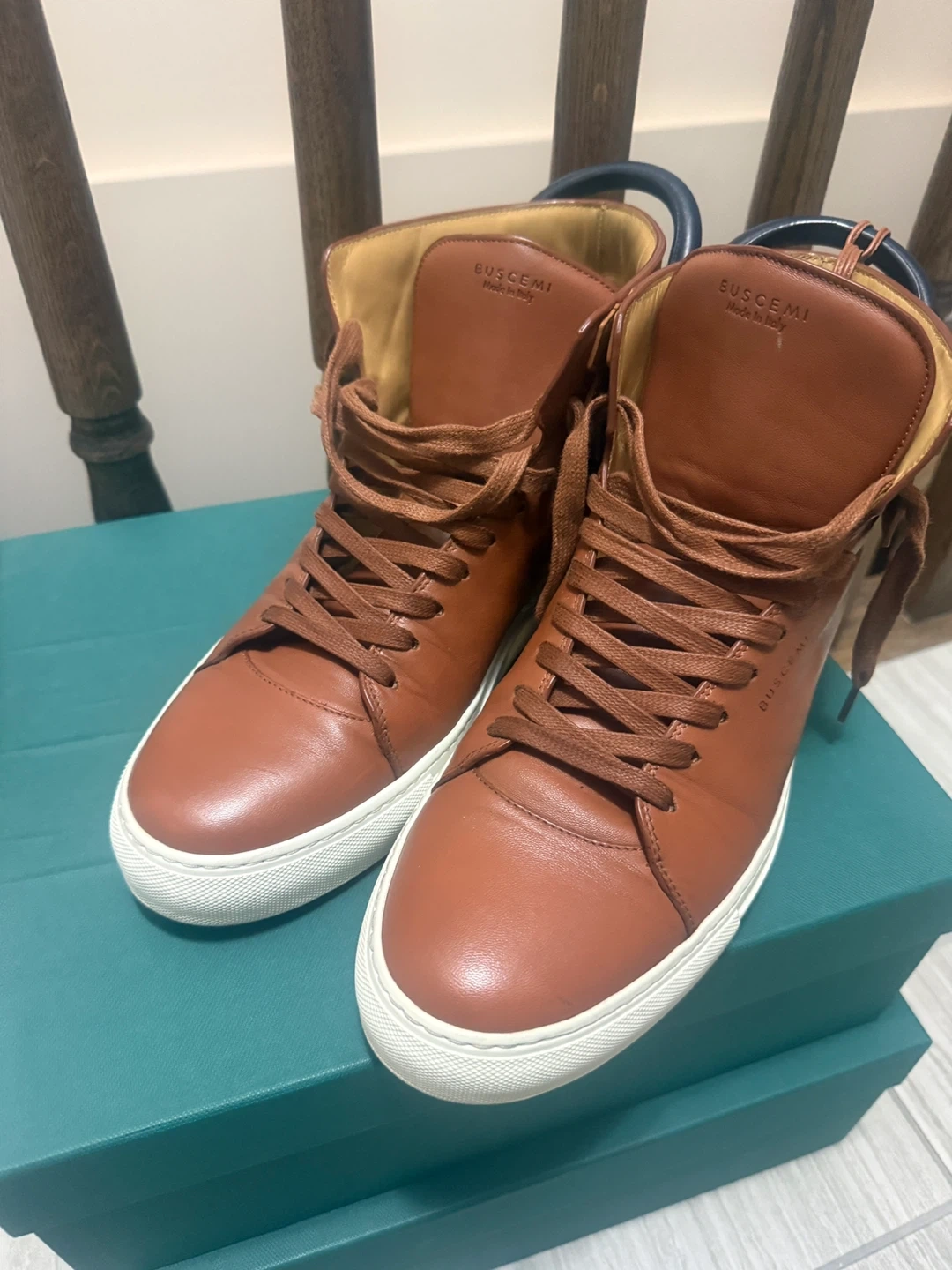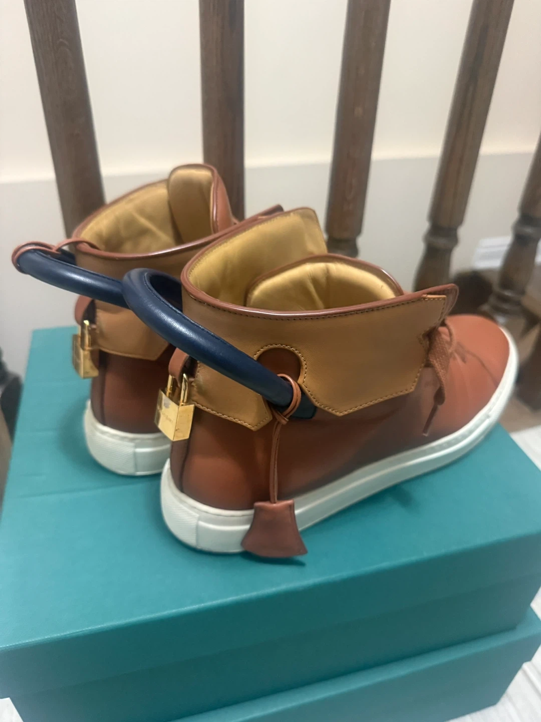 Buscemi high top sneakers in a tri-color design. Features a Bourbon/Vegetan/White colourway and a size 12 (45) fit. Made in Italy. Includes original box and iconic padlock detail.