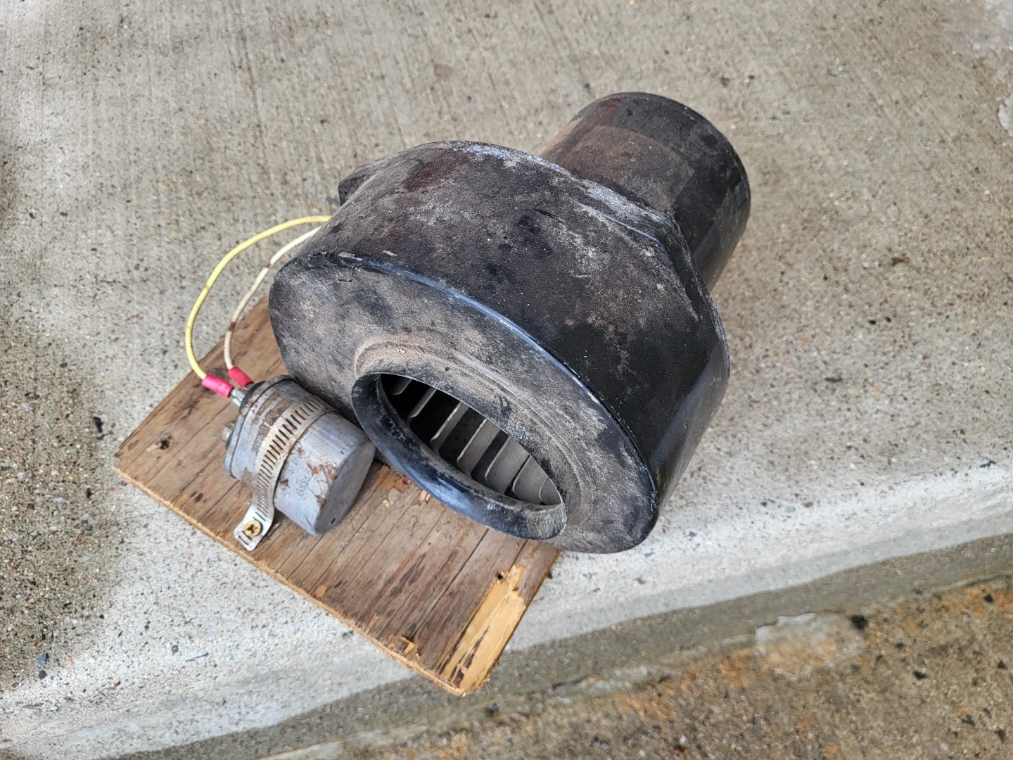 This is a used black blower fan motor assembly. It's mounted on a wooden base for stability. Comes with a capacitor attached to the motor housing. This unit appears to be in working condition.