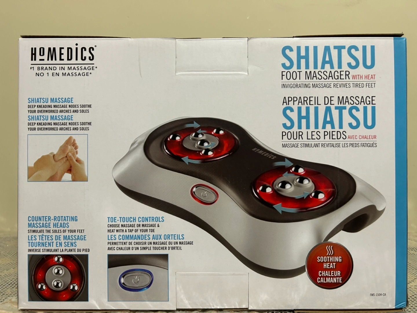 Foot massager with heat, counter-rotating massage heads, toe-touch controls, and soothing heat.