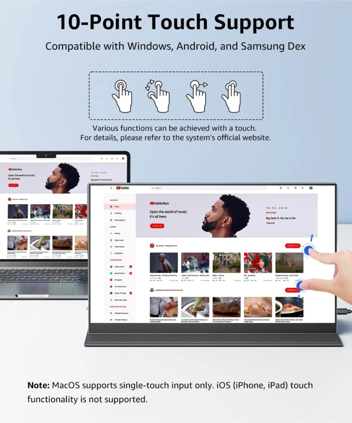 Worth Noticing: On Windows, it delivers smooth, responsive 10-point touch—enabling seamless swiping and zooming. Note: MacOS ONLY supports single-point touch; iOS DOES NOT support touch function at all; USB-C to USB-C connection requires DP Alt/HDMI Alt protocol support. Please confirm your device’s compatibility beforehand