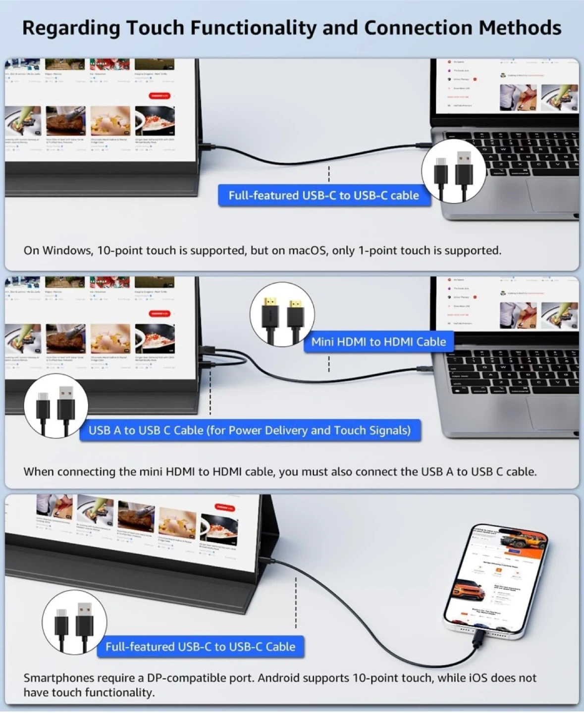 10-Point Touchscreen Portable Monitor]: This portable display is compatible with both Windows and MacOS systems. Touch functionality is enabled for your laptop via a single connection using a full-featured Type-C interface. NOTE: For devices with Type-C 3.1 DP ALT-MODE or Thunderbolt 3/4 ports, use the provided USB-C to USB-C cable to transmit power, video, and touch signals. For devices without these ports, please connect using an HDMI cable for video, a power cable, and a USB-A to USB-C cable (touch functionality will not be available if the USB-A to USB-C cable is not connected)