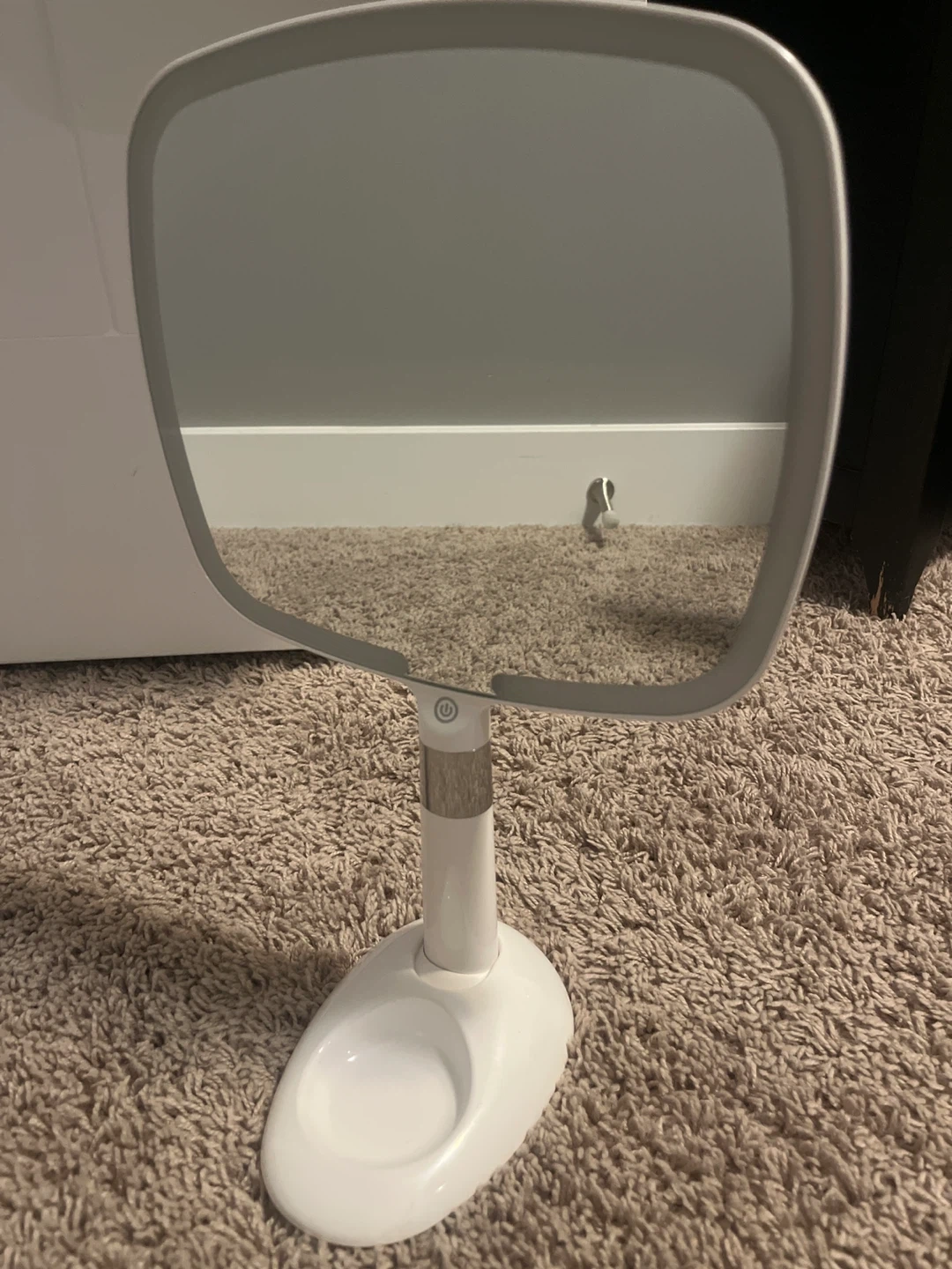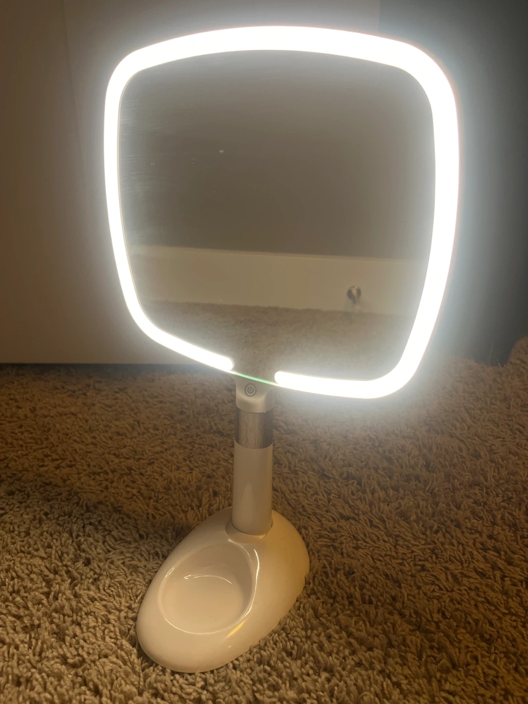 Portable light mirror with three different light options. Comes with a stand that adjusts and has a small dish to store accessories like hair ties. Charges with USB-C cable.