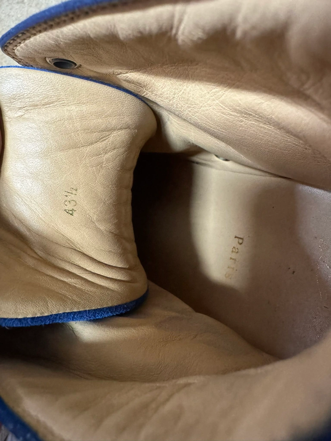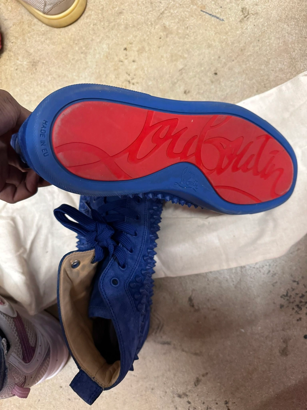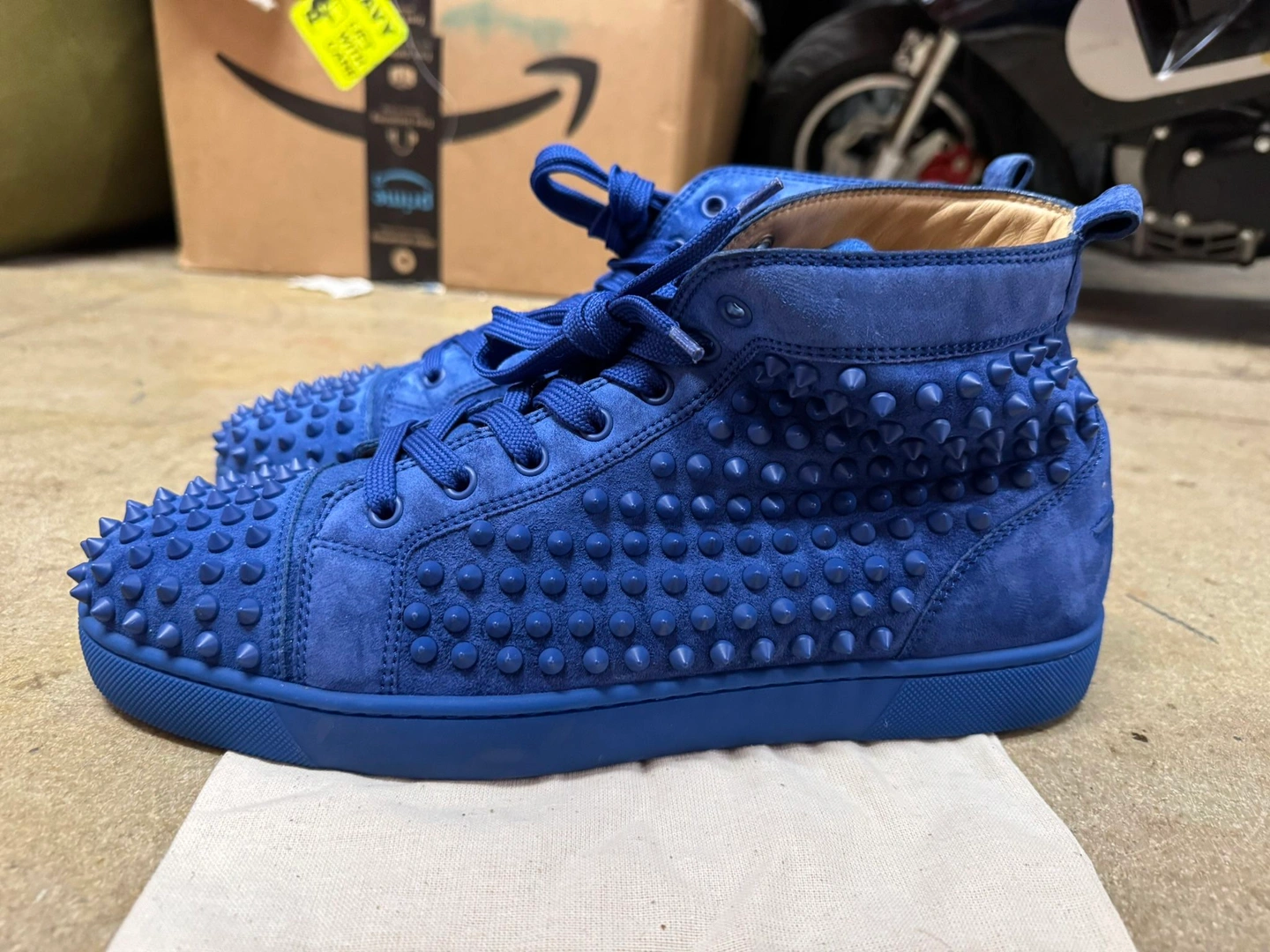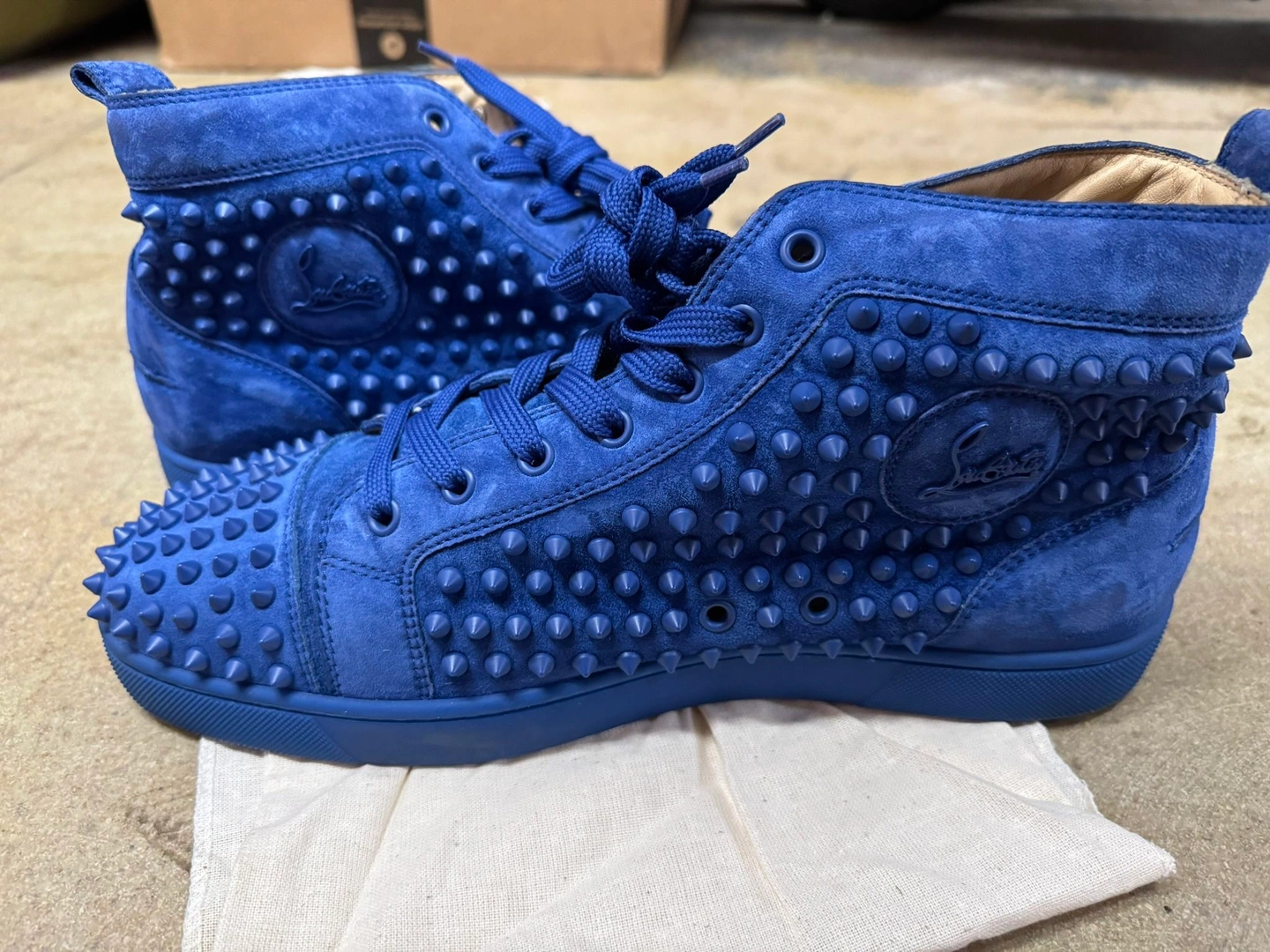 This is a size 43.5 EU (9.5 men) pair of Christian Louboutin Louis Spikes high-top sneakers in electric blue suede