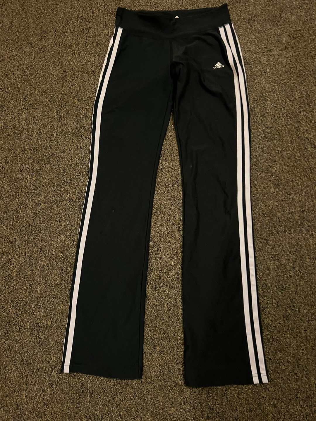These black Adidas athletic pants are made with Climalite fabric. They feature the classic three white stripes down the sides. Size 10/66A.
