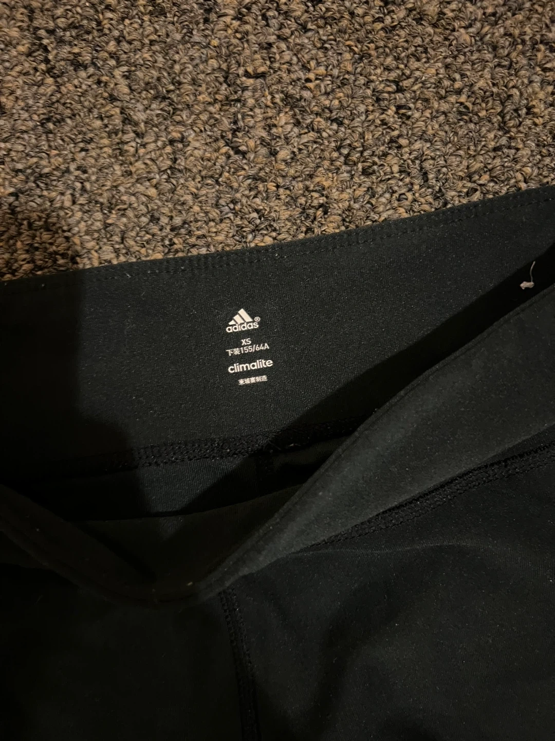These black Adidas athletic pants are made with Climalite fabric. They feature the classic three white stripes down the sides. Size 10/66A.