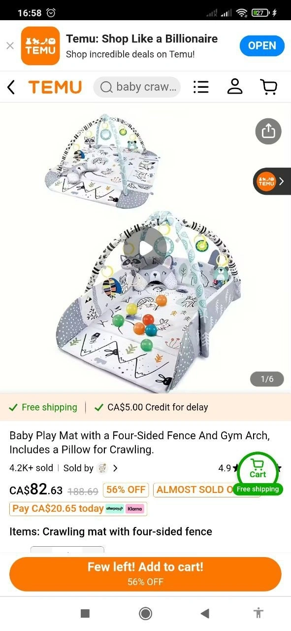 Brand new in box, never opened TFDER 8-in-1 Montessori Baby Gym Play Mat. Perfect for tummy time, sensory play, and early motor skill development. Designed to grow with your baby, it offers multiple play modes including tummy time, seated play, crawling, and ball pit fun. Includes: 6 soft animal toys (with sound effects, a self-discovery mirror, safe teethers, and a tummy-time support pillow), 18 balls, play mat, tummy pillow, mirror & teethers. The foldable surround fence keeps baby safe and transforms into a ball pit as they grow. Features: 8-in-1 play modes, soft, phthalate-free, baby-safe materials, non-slip bottom, easy-clean surface, converts into ball pit, extra-large size (39.4" x 43.3"), portable & foldable. Perfect for baby showers, birthdays, holidays, or newborn gifts. Supports sensory learning, hand-eye coordination, crawling, sitting, and early development. Age: 1-18 months. Care instructions: Machine Washable. Size: 39.4" x 43.3" x 21 inches. Color: Black & White. MAT, TOYS, BALLS ARE INCLUDED! Price: $45. Pickup locations: SW - Cedardale Bay SW, NW - Arbour Lake NW, NE - Airport area NE (weekdays 10am-12pm only). Cash accepted.