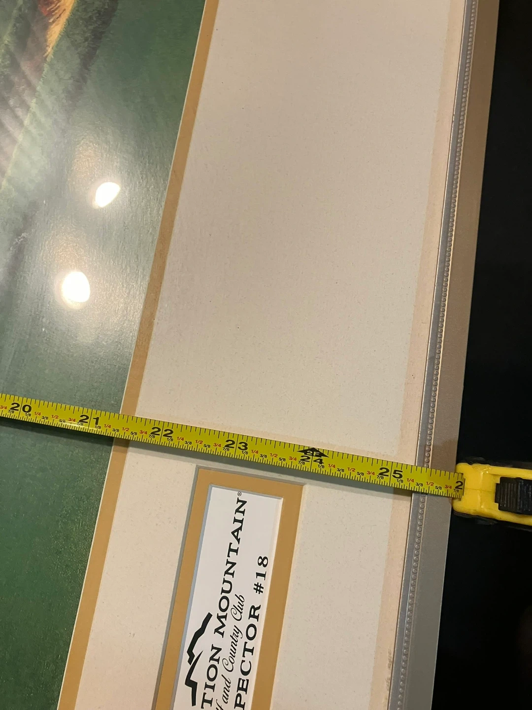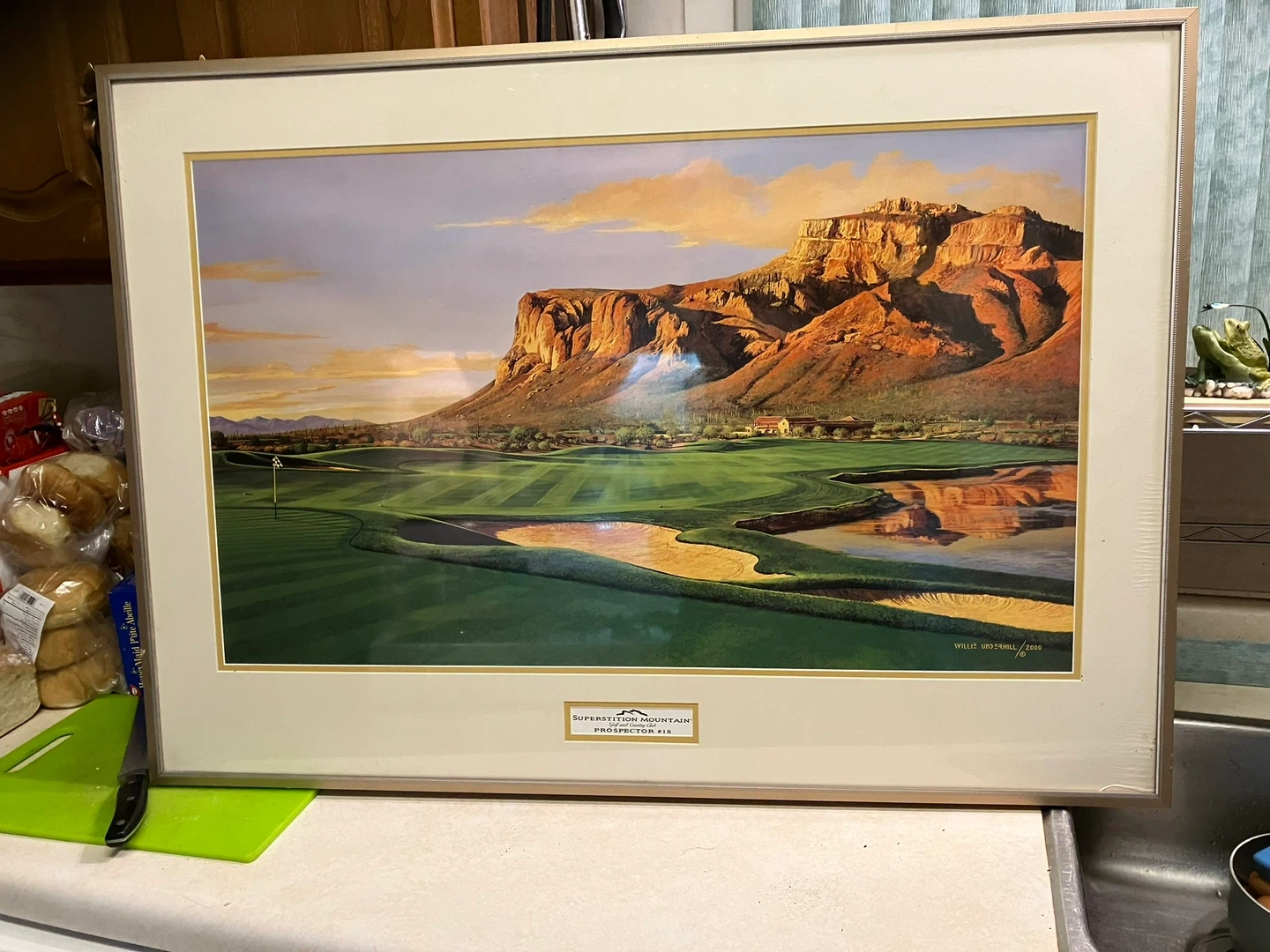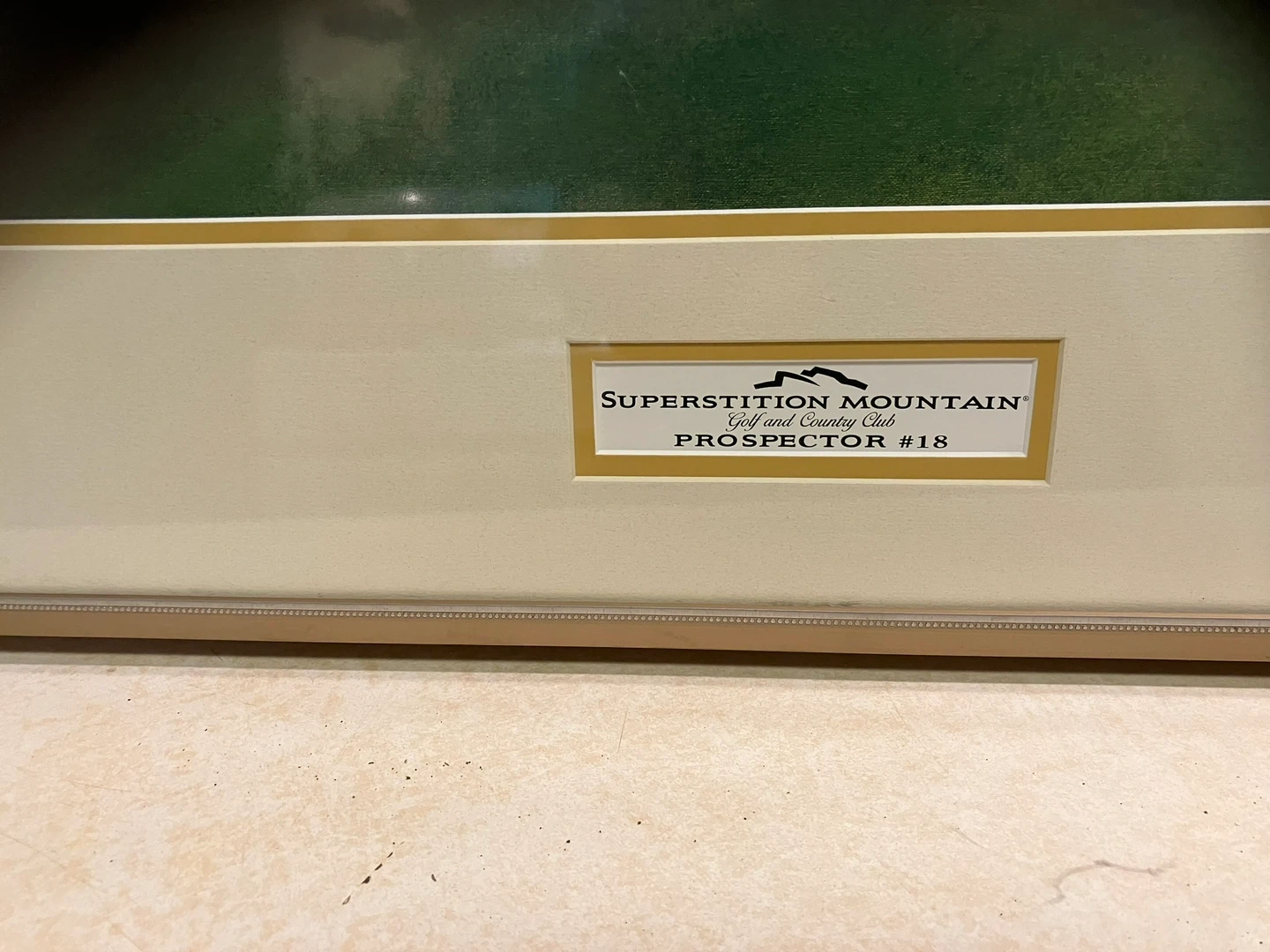 Framed print of the Superstition Mountain Golf and Country Club, Prospector #18. The frame is gold-toned with a beaded edge. Dimensions are approximately 34 inches wide by 24 inches high. It's a nice piece for any golf enthusiast or fan of desert landscapes!
