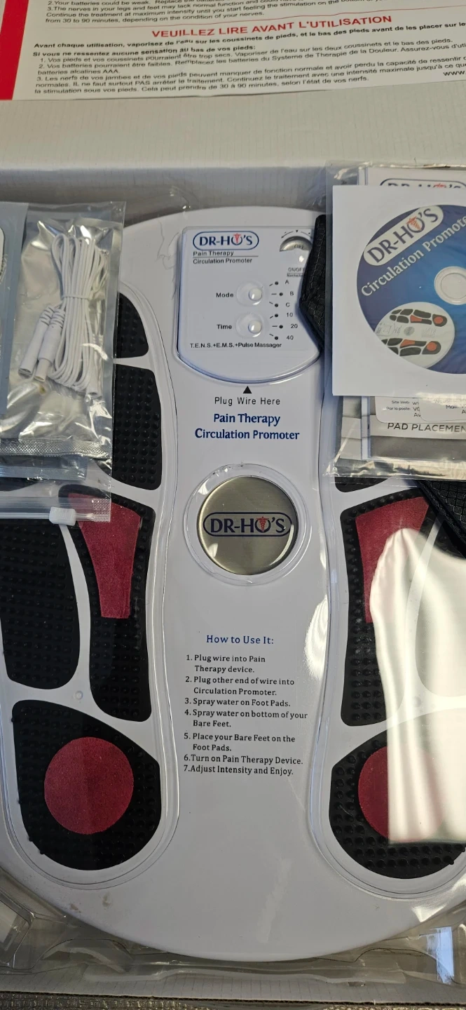 Dr. Ho's Circulation Promoter helps with pain therapy and circulation. It has multiple modes and intensity settings. Spray the foot pads with water before use for best results.