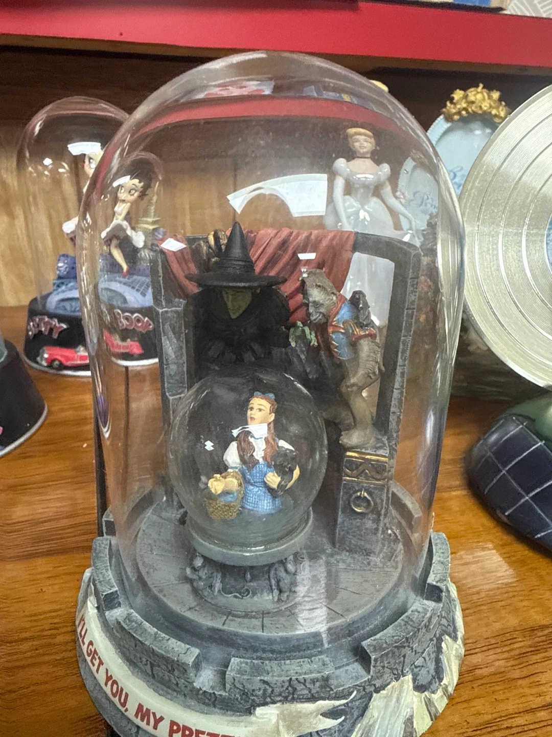 This Wizard of Oz snow globe features Dorothy, the Wicked Witch, the Cowardly Lion, and Glinda. The base has the quote 'I'll get you, my pretty' printed on it. It's a fun collectible for fans of the classic movie!