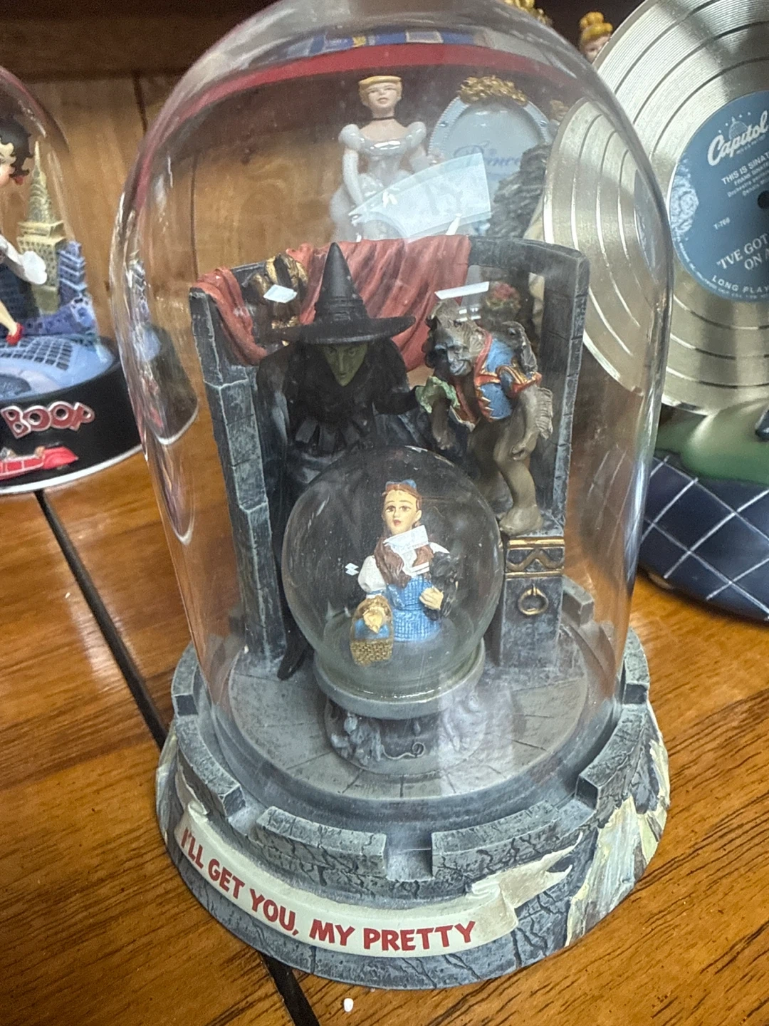 This Wizard of Oz snow globe features Dorothy, the Wicked Witch, the Cowardly Lion, and Glinda. The base has the quote 'I'll get you, my pretty' printed on it. It's a fun collectible for fans of the classic movie!