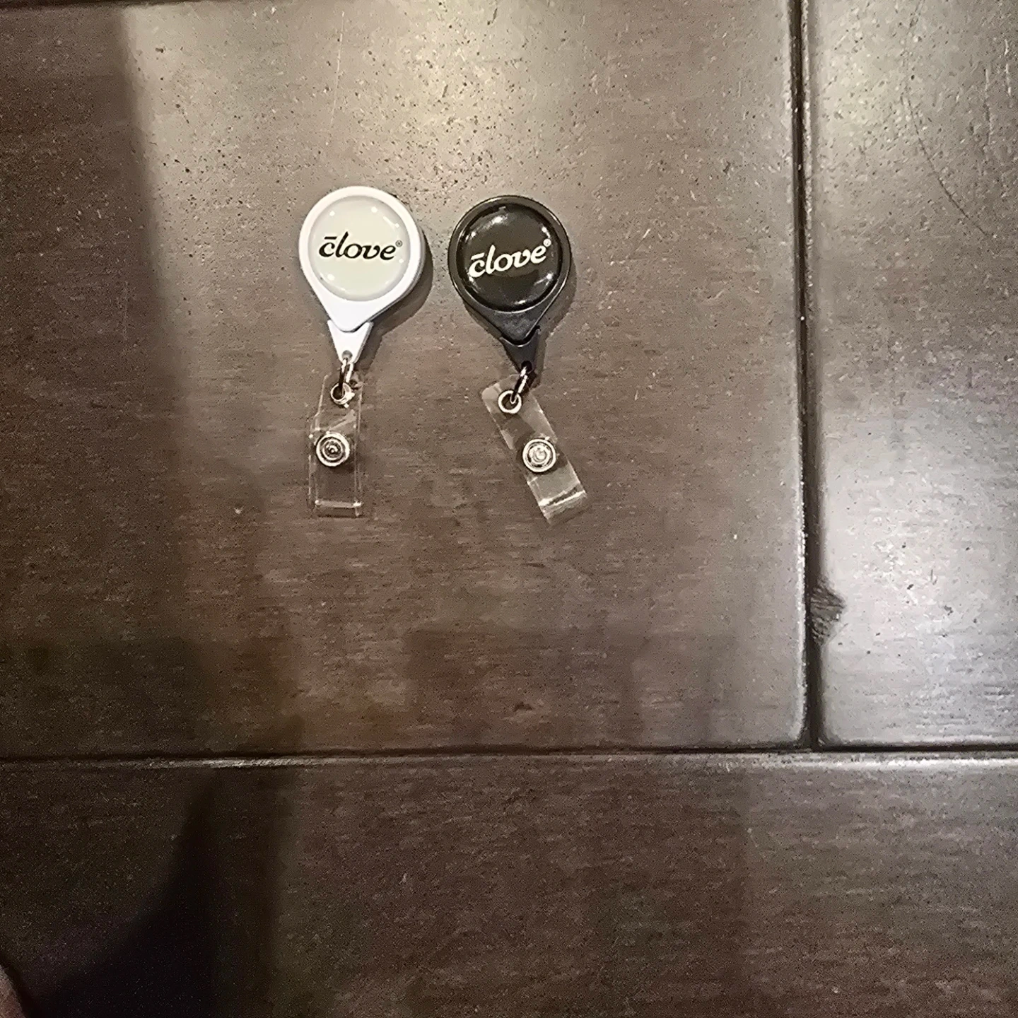 Two retractable badge holders from Clove. One is white and the other is black. They include clear plastic strap attachments for ID cards or keys. These are handy for keeping your credentials accessible!