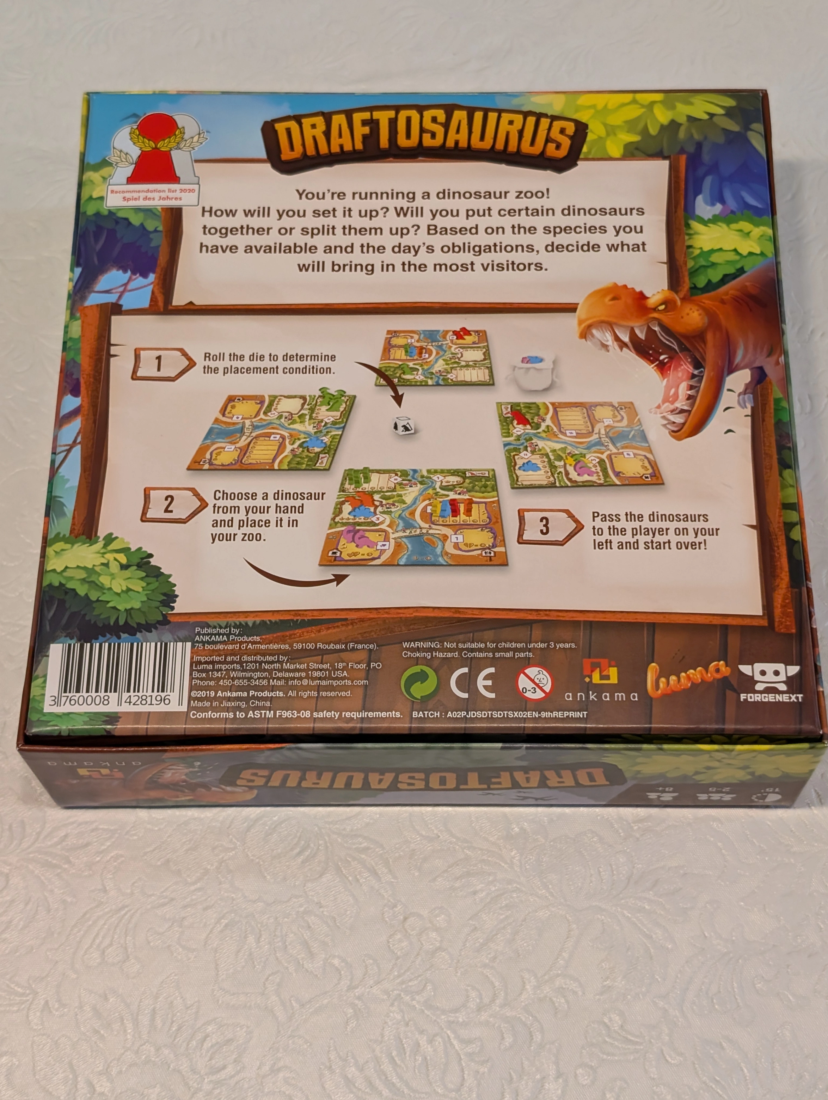 Your goal in Draftosaurus is to have the dino park most likely to attract visitors. To do so, you have to draft dino meeples and place them in pens that have some placement restrictions. Each turn, one of the players roll a die and this adds a constraint to which pens any other player can add their dinosaur.