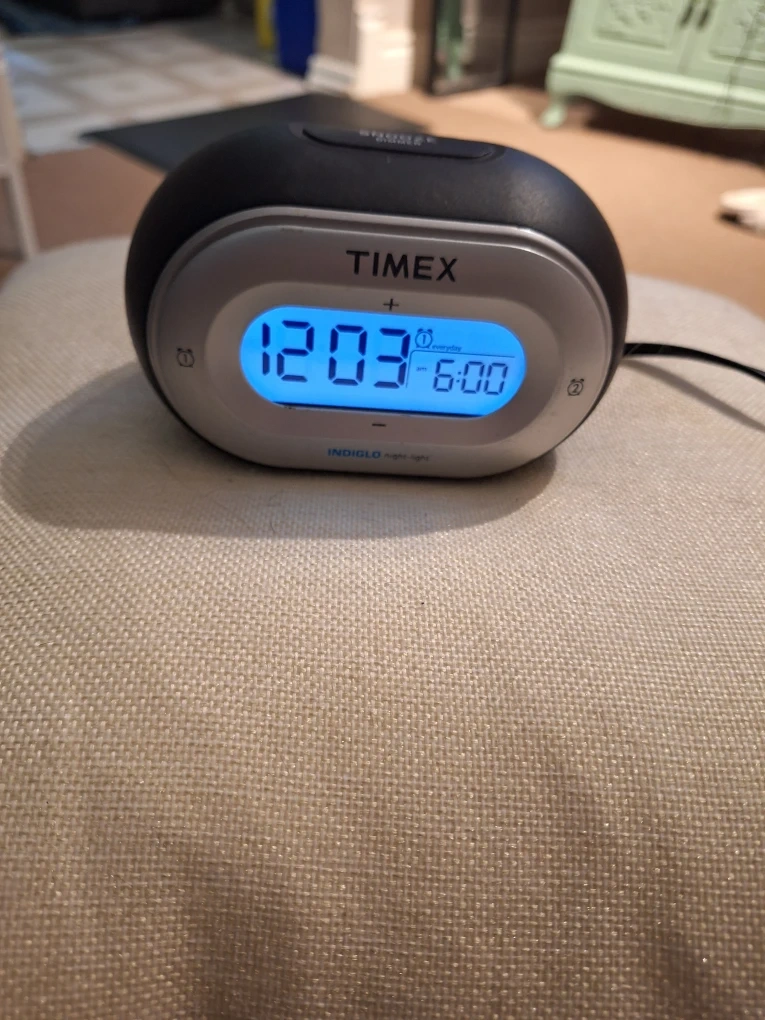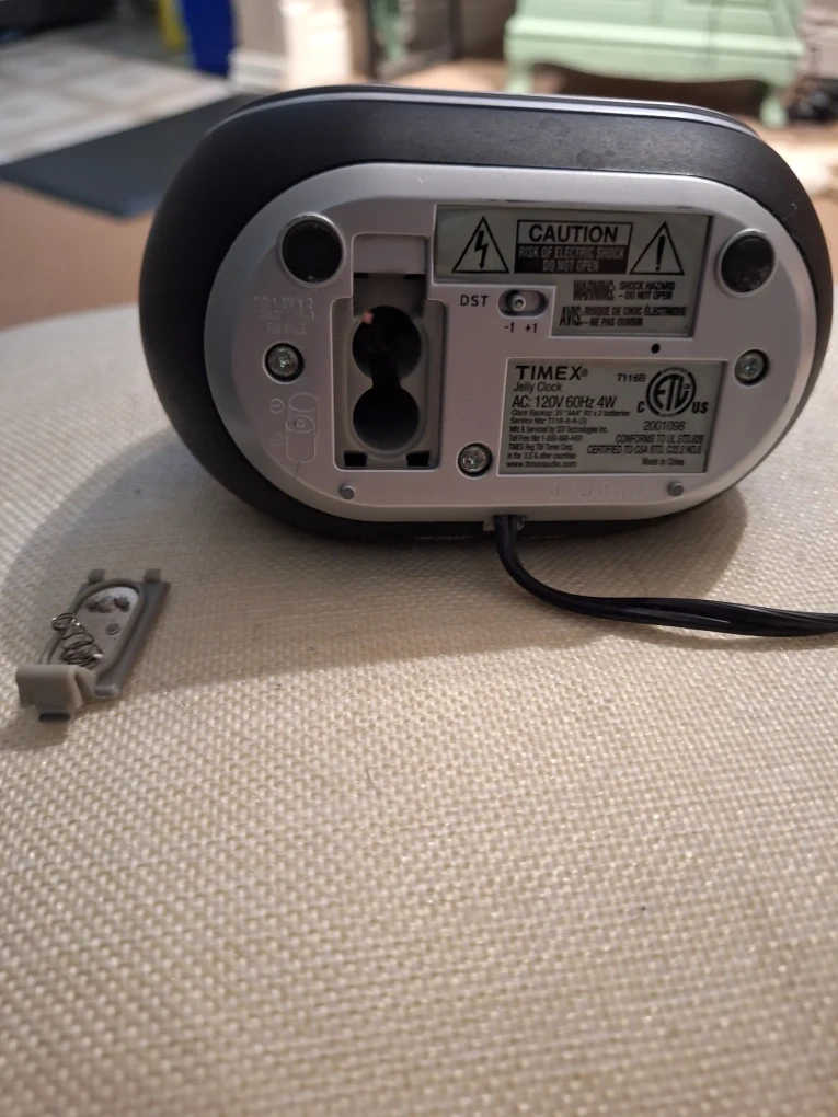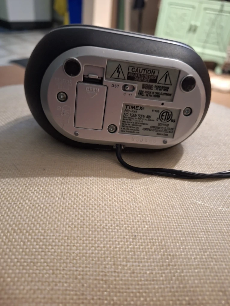 This is a Timex jelly alarm clock with an Indiglo night-light. It's powered by AC and has a 4W rating. It takes AA batteries for backup.