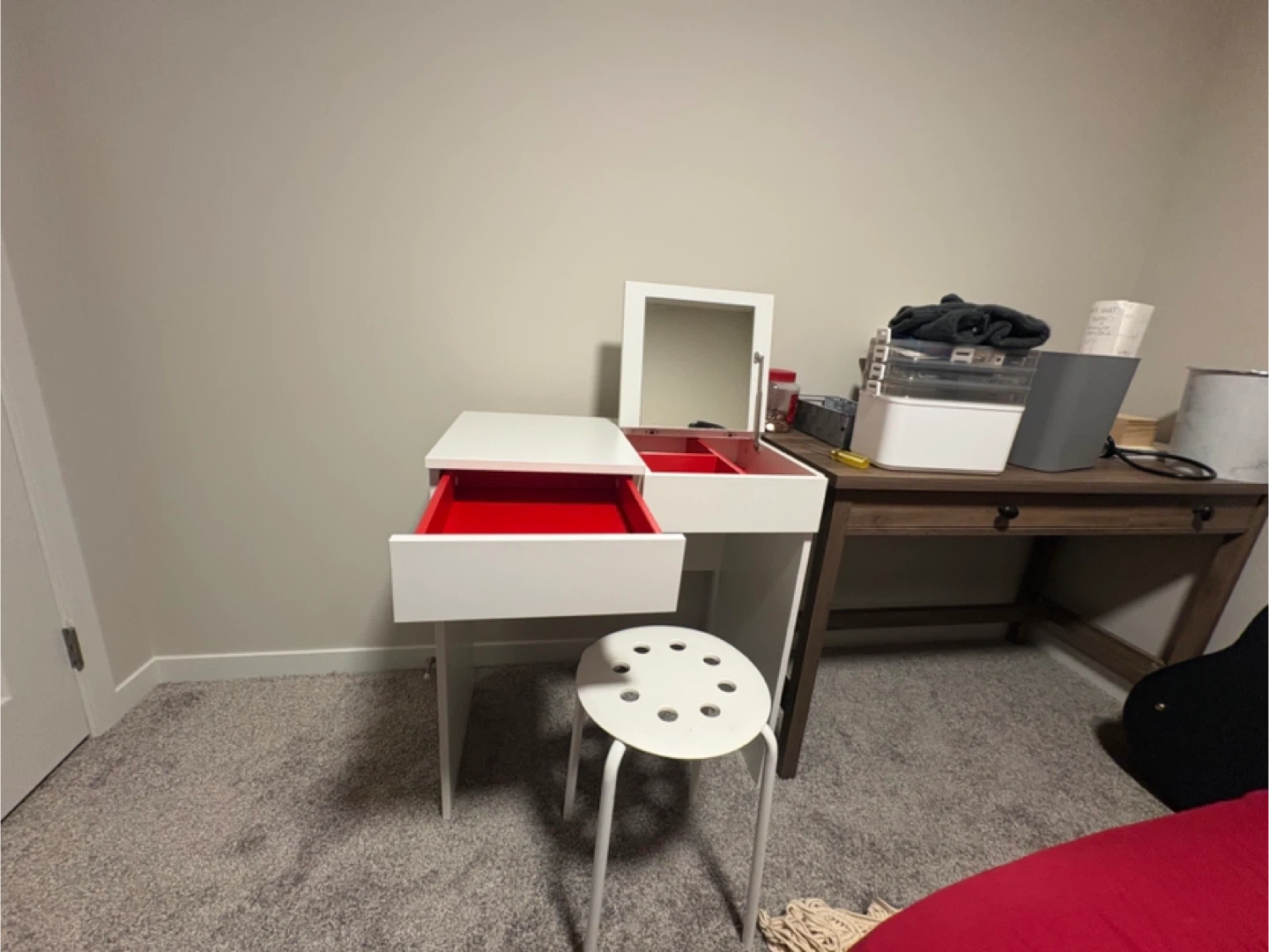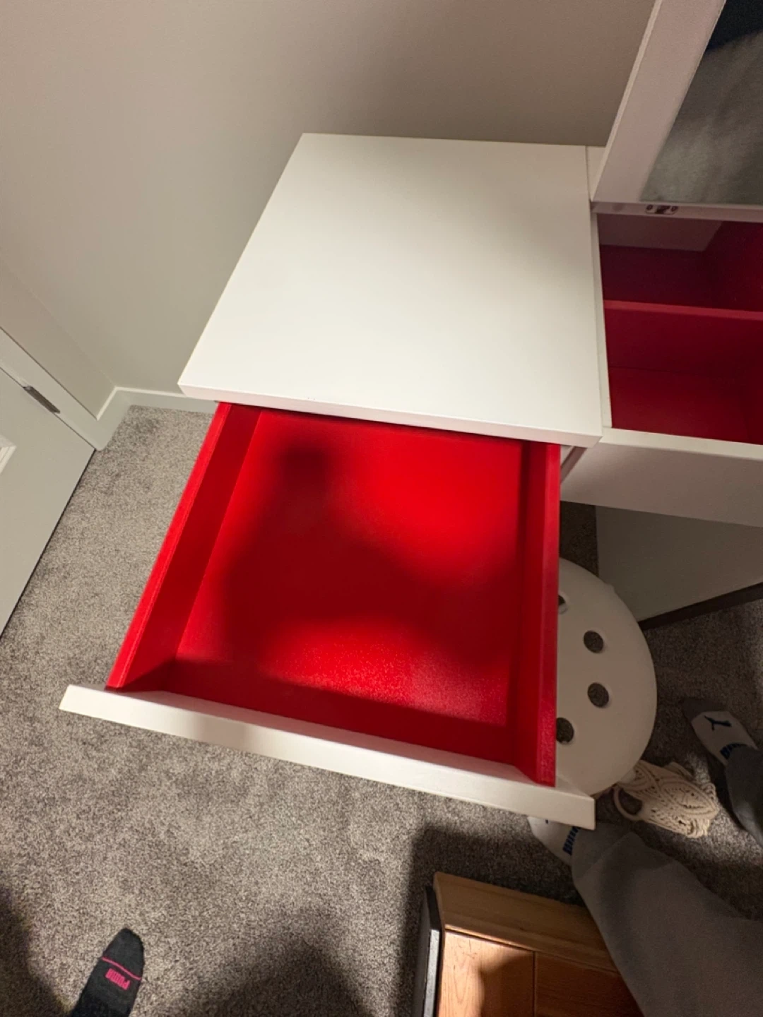 Compact white vanity desk featuring a mirrored lid and bright red lined compartments for organization. It includes one deep drawer and a smaller top drawer, perfect for makeup or accessories. This desk would be great for a bedroom or dressing area!