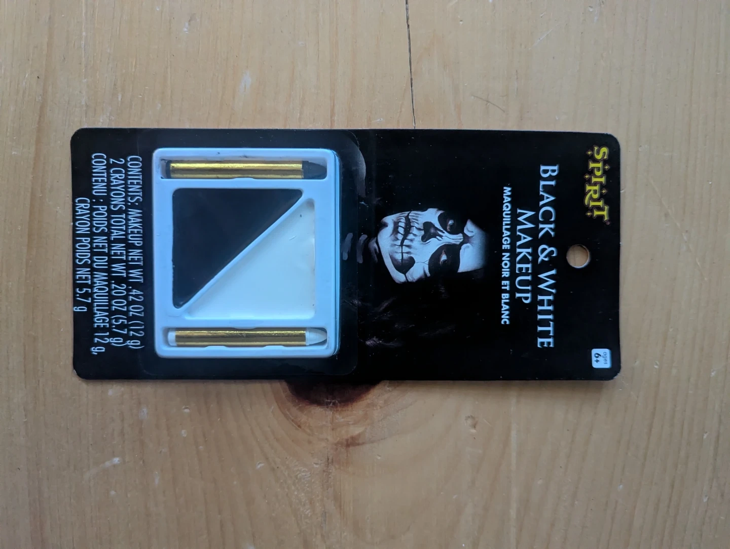 Spirit Black & White makeup kit with two crayons. Makeup net wt .42 oz (12 g), total crayon net wt .20 oz (5.7 g). Ages 6+.
