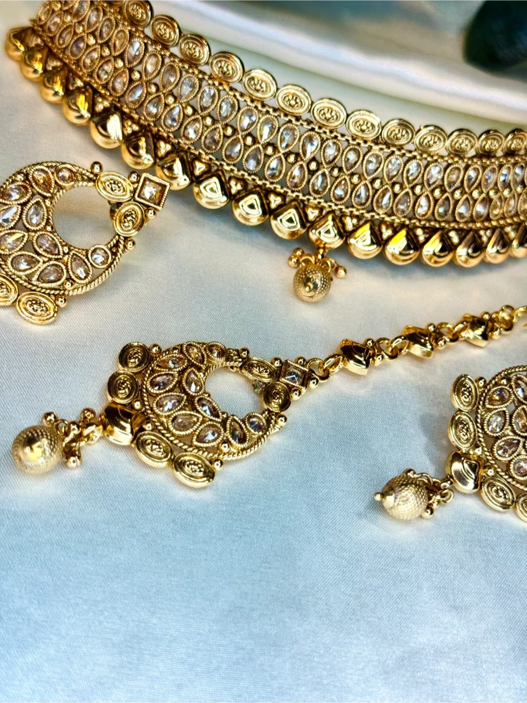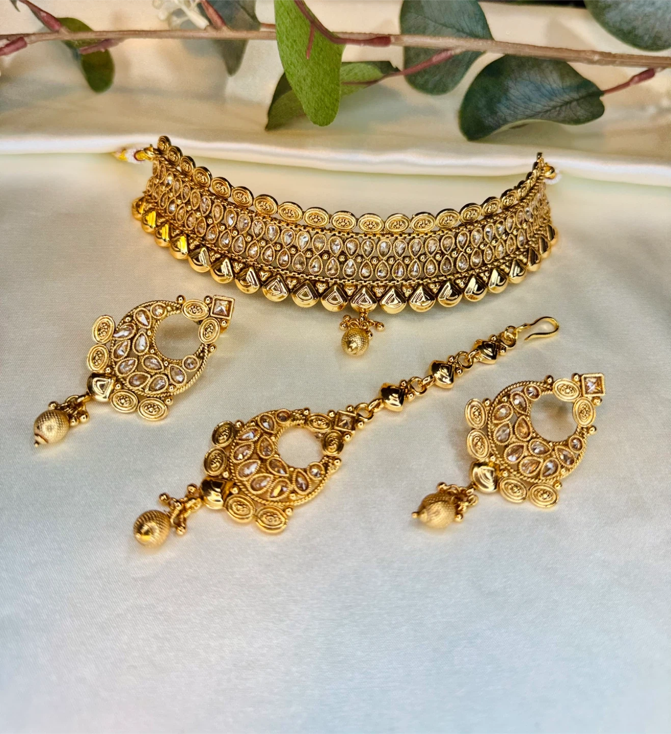 Beautiful gold-toned Indian jewellery set including a choker necklace, matching earrings, and a tikka. Intricately designed with clear stones and dangling pearls. It's perfect for special occasions and cultural events.
