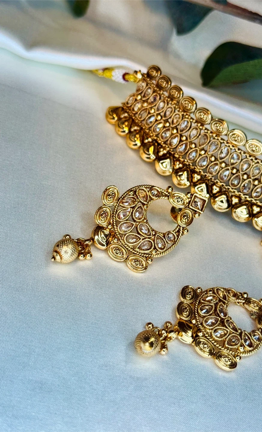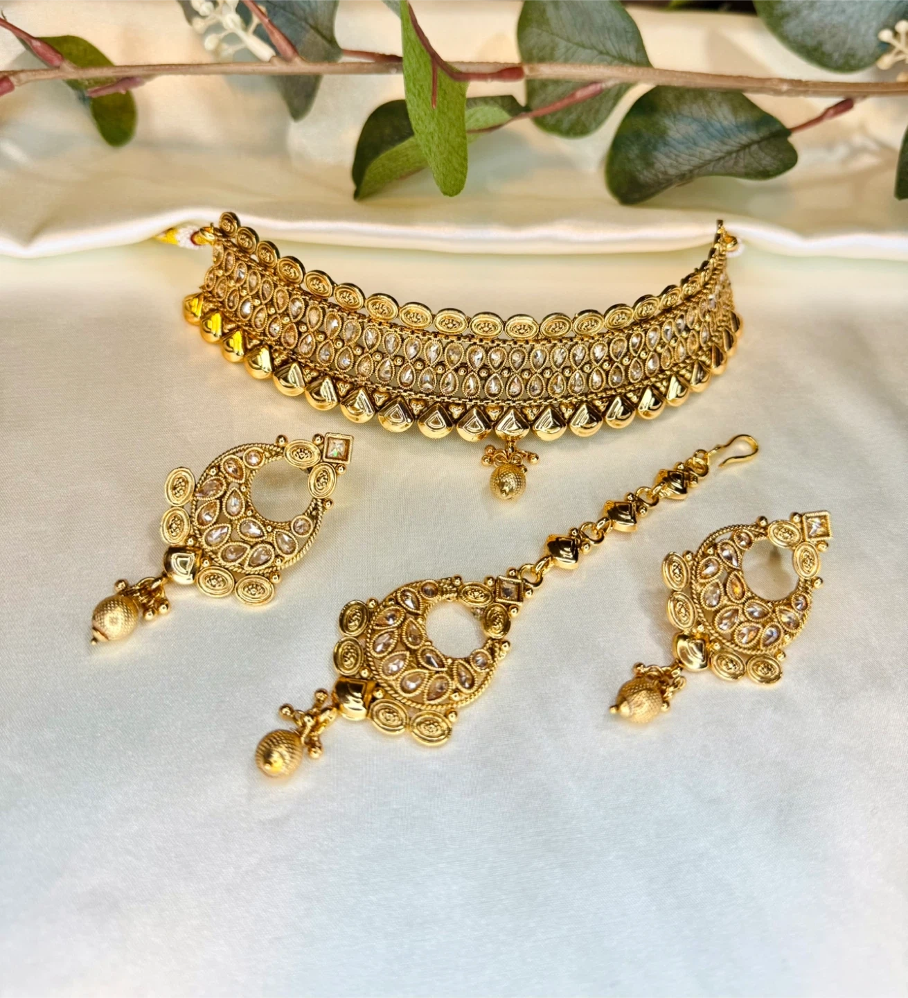 Beautiful gold-toned Indian jewellery set including a choker necklace, matching earrings, and a tikka. Intricately designed with clear stones and dangling pearls. It's perfect for special occasions and cultural events.