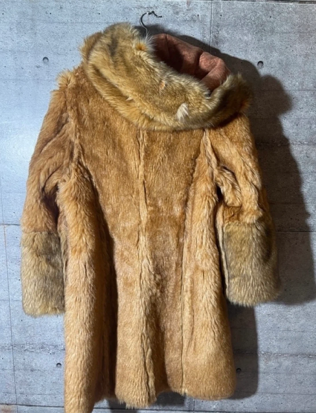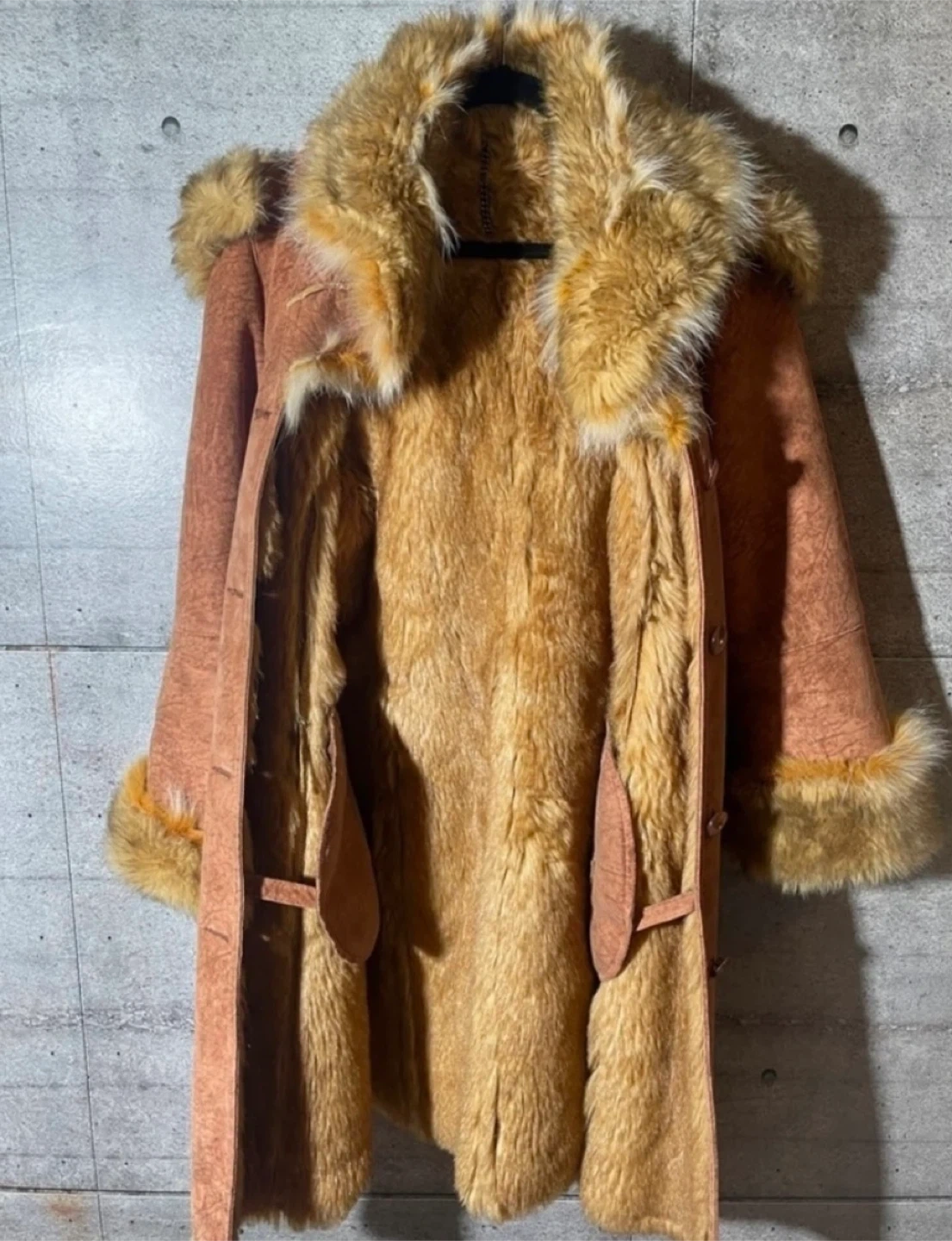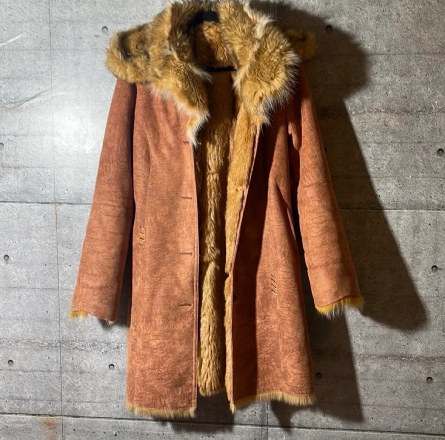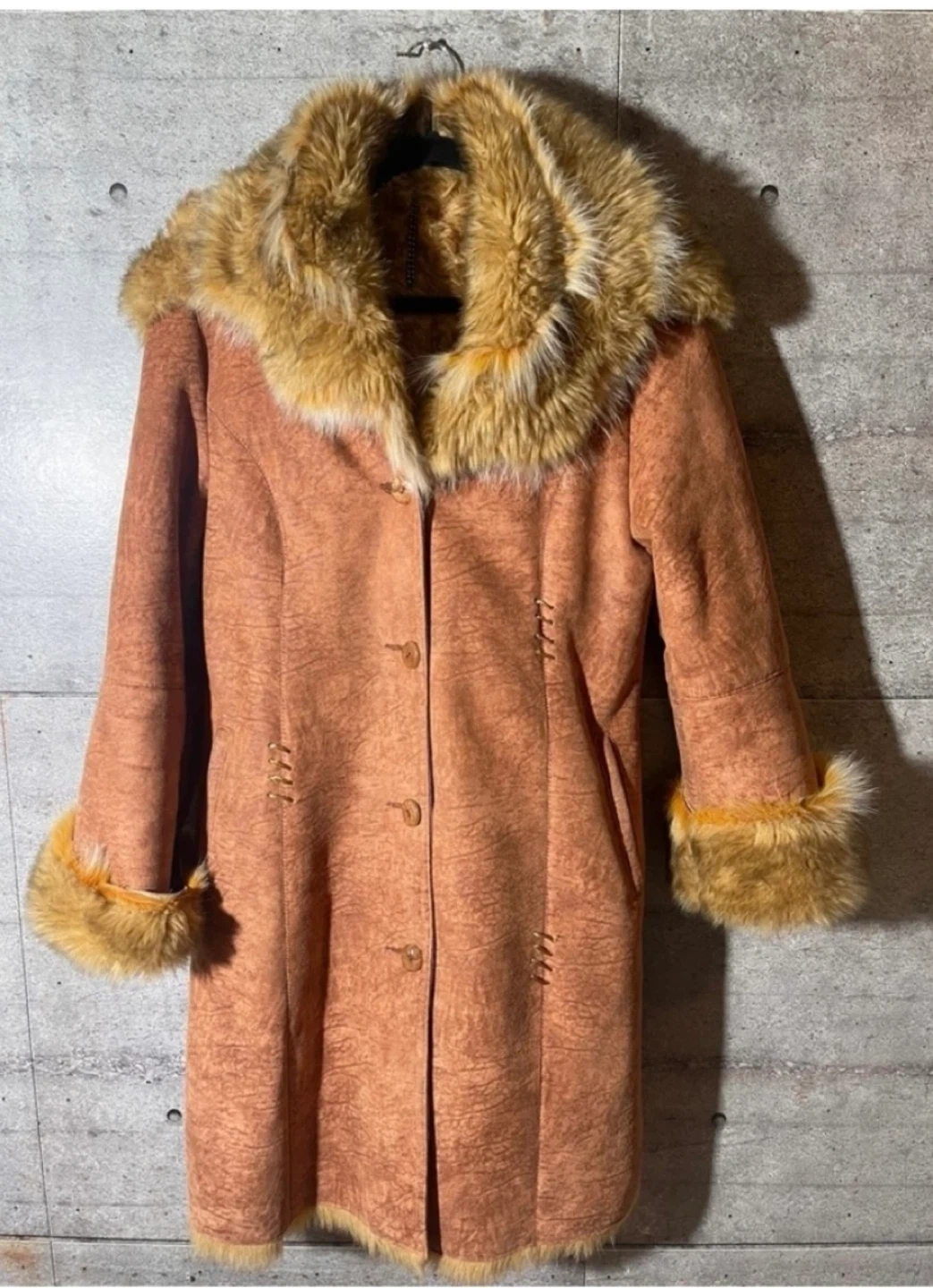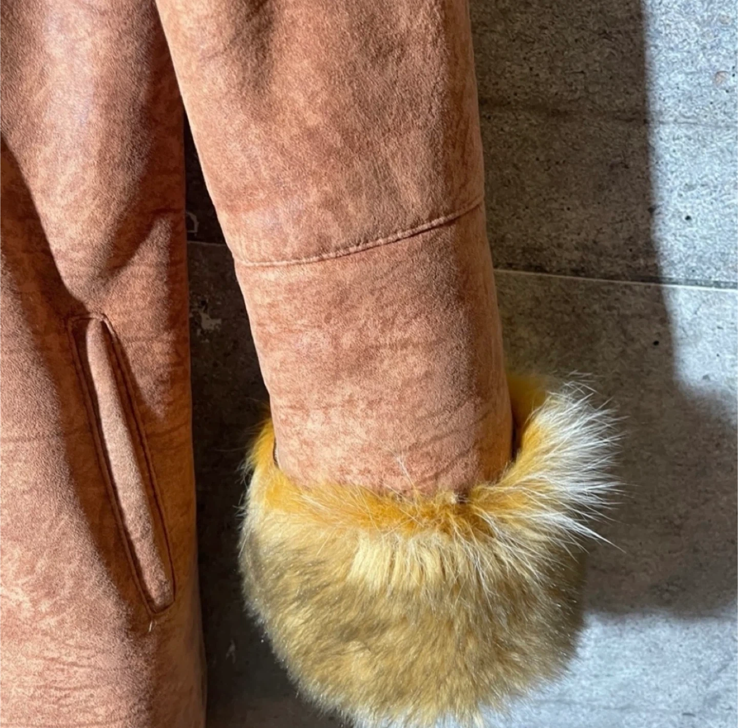 Vintage long faux shearling coat featuring a warm suede-look exterior and plush faux fur interior. This statement winter coat has a dramatic fur-trimmed hood, fur cuffs, and full faux fur lining for warmth and texture.