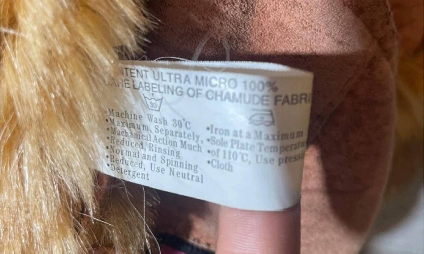 The coat includes front button closure and functional side pockets. The interior label indicates 100% chamude fabric (microfiber faux suede), giving the appearance of suede with a soft, structured feel.