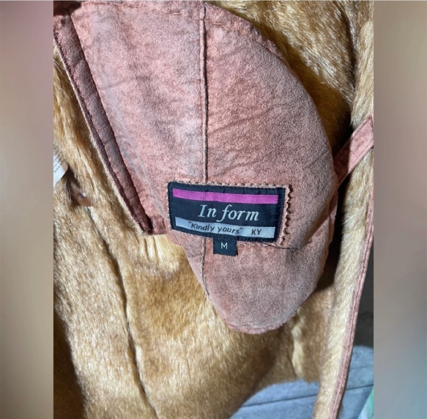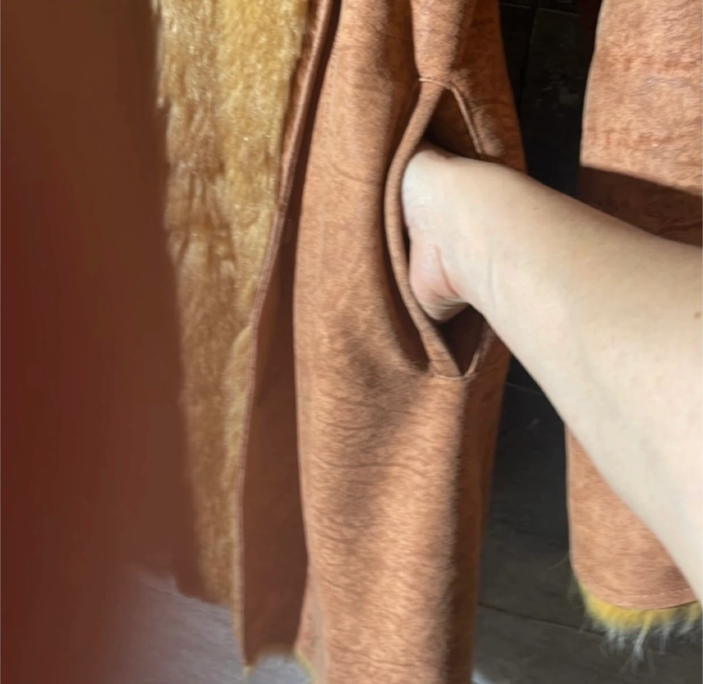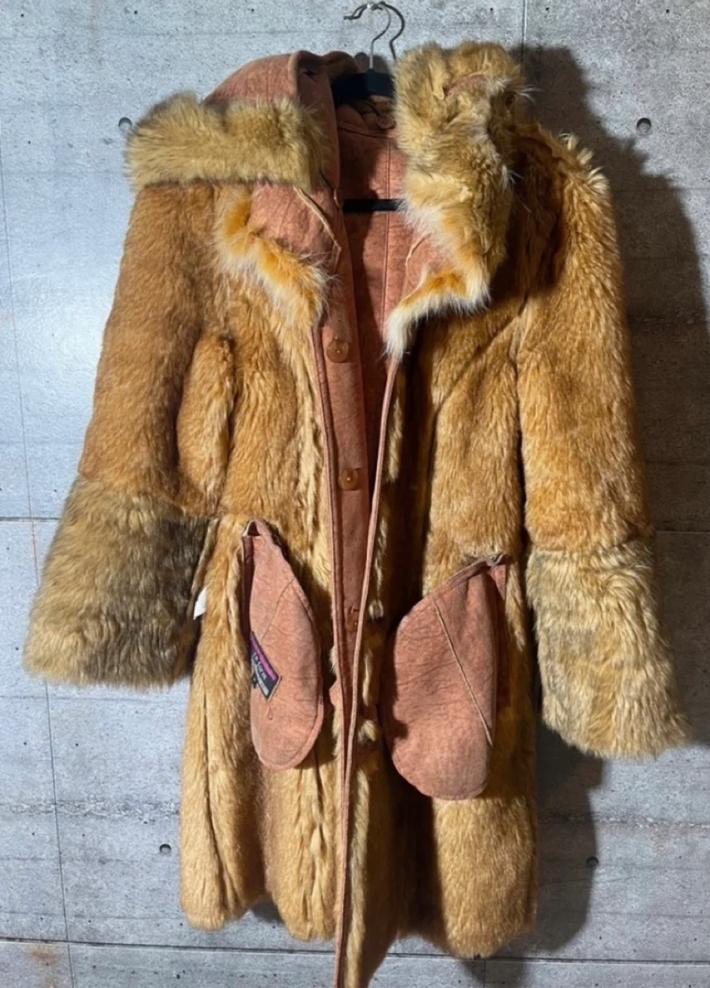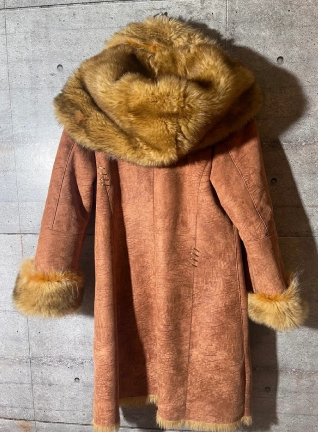 Vintage long faux shearling coat featuring a warm suede-look exterior and plush faux fur interior. This statement winter coat has a dramatic fur-trimmed hood, fur cuffs, and full faux fur lining for warmth and texture.