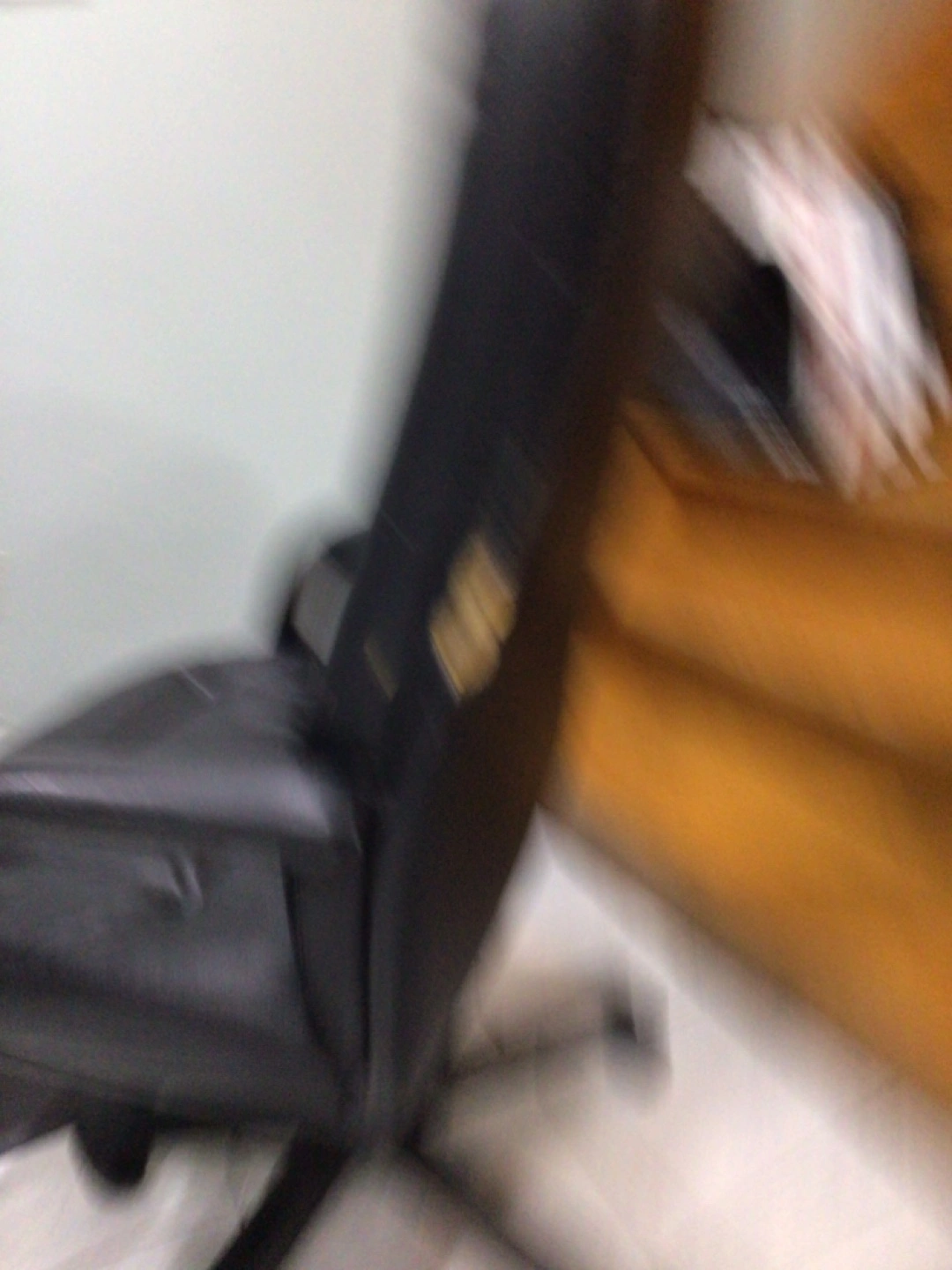 Comfortable office chair, black leather. Some wear and tear visible. Swivel base with casters. Good for home or office use.