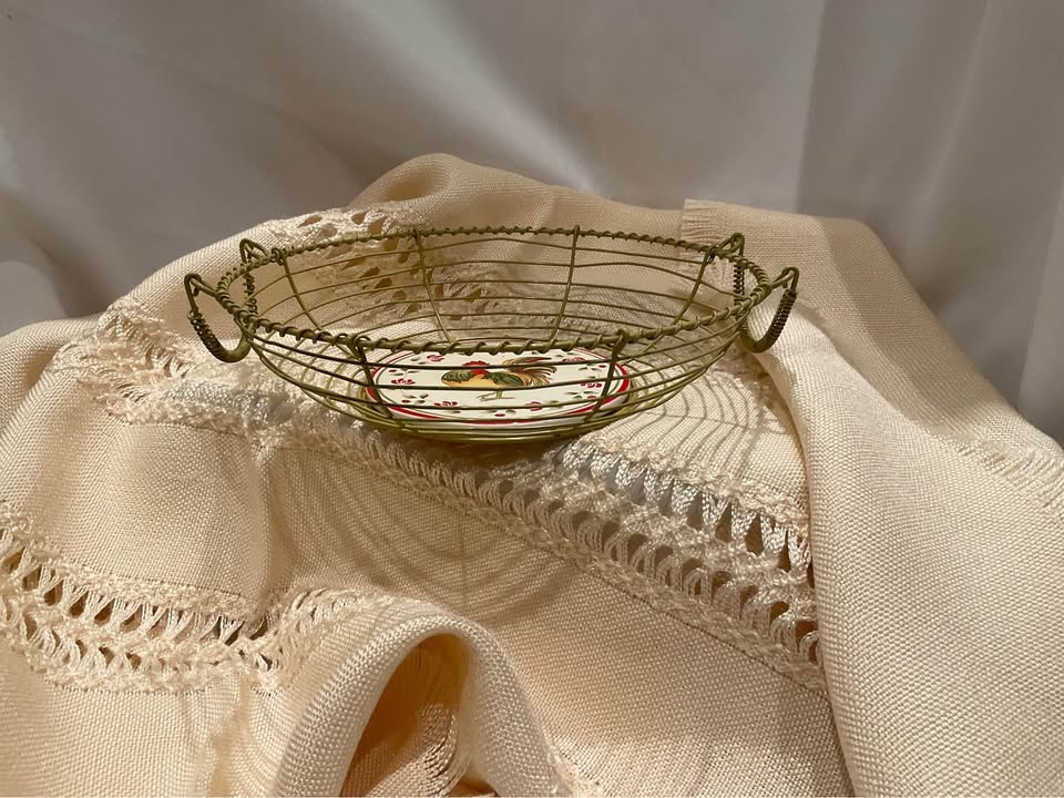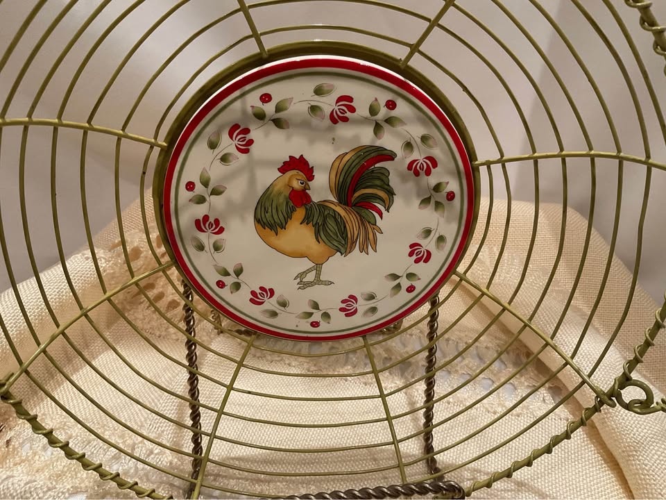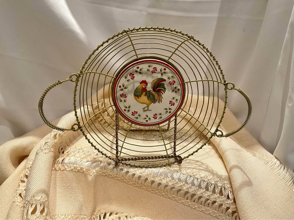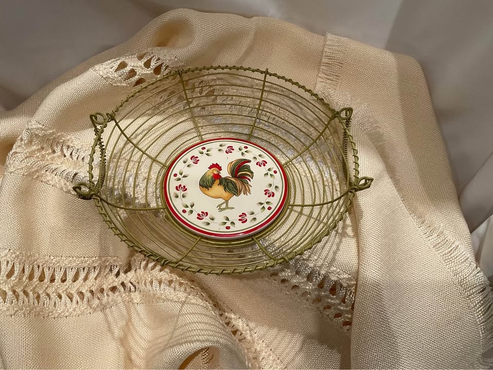 Beautiful Metal Rooster Basket. Ceramic Rooster Plate. Royal Doulton Chanticlair Basket. Width 11”. #202/350. Cash Only - Richmond Hill / Bathurst & King Rd.