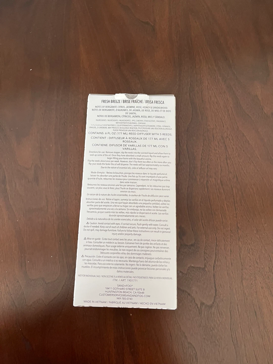 This is a SAND+FOG Fresh Breeze reed diffuser. It contains 177 ml of fragrance oil. Flip the reeds about once per week to refresh the scent. It's inspired by the California coast.