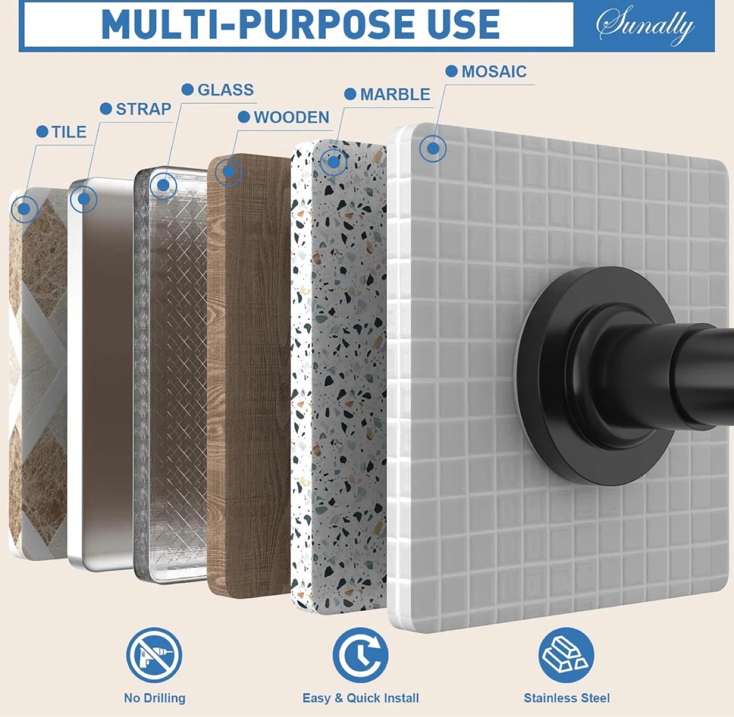 It's waterproof and not easy to rust, featuring a larger contact area for anti-slip grip. Perfect for bathrooms, bedrooms, or laundry rooms without drilling!