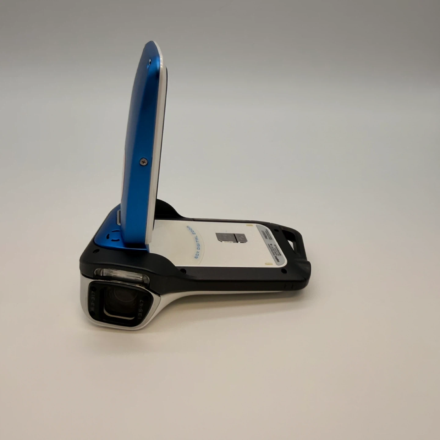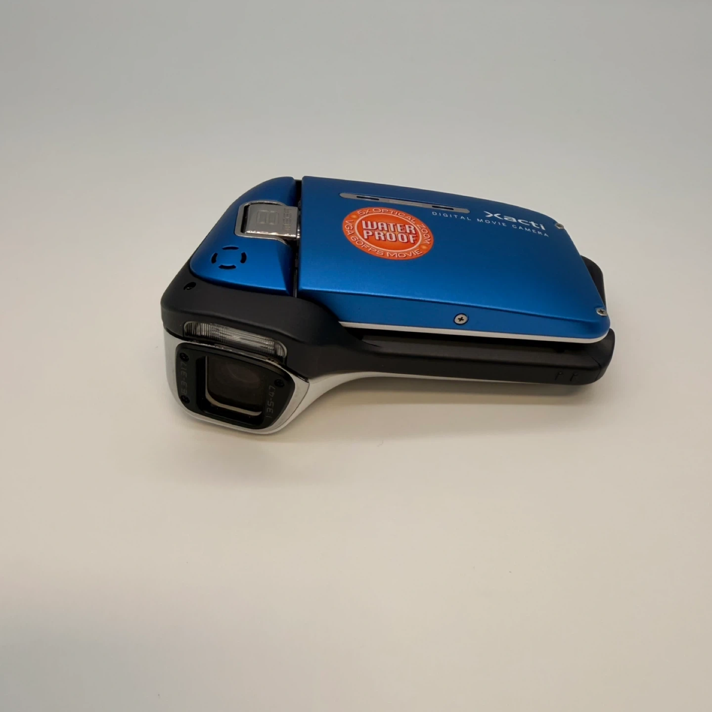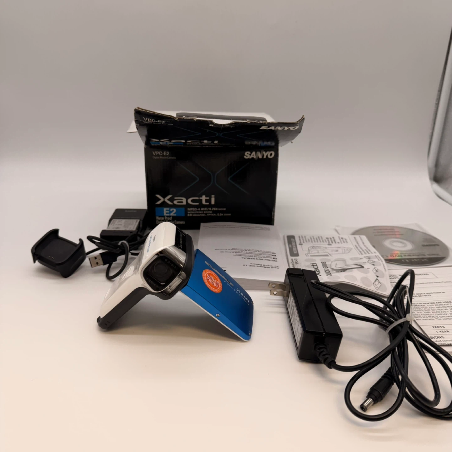 This is a blue Sanyo Xacti E2 waterproof digital movie camera. It's designed to record video and capture photos. The camera is waterproof and comes with its original box and accessories.