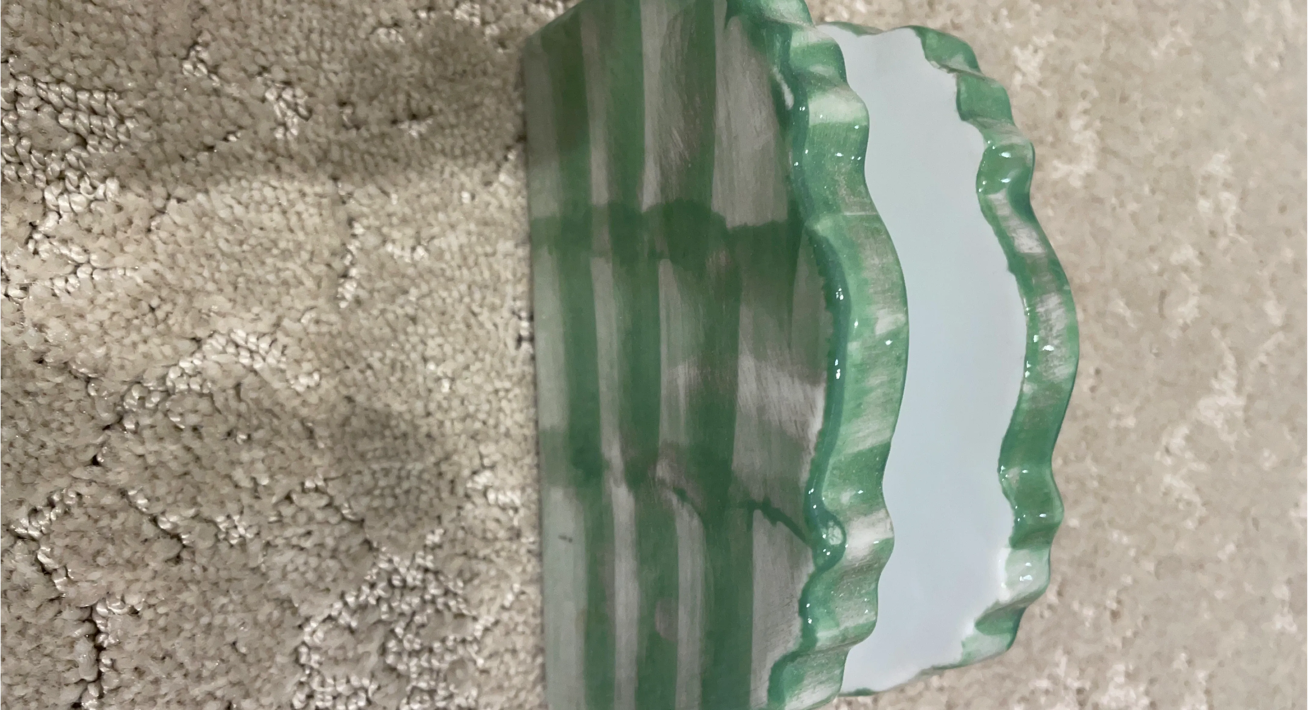 This napkin holder has a green and white striped pattern with a wavy edge. It's made of ceramic material.