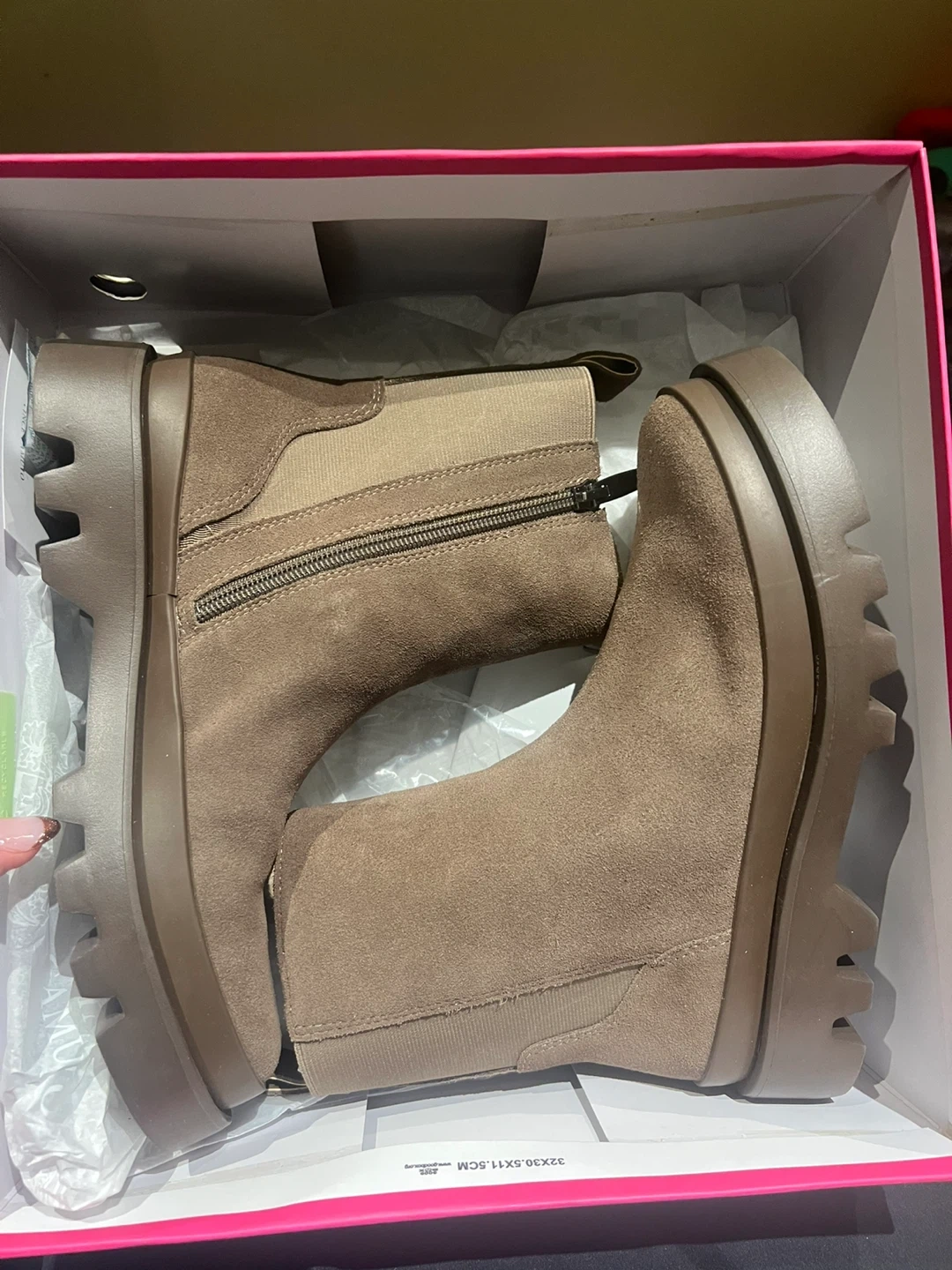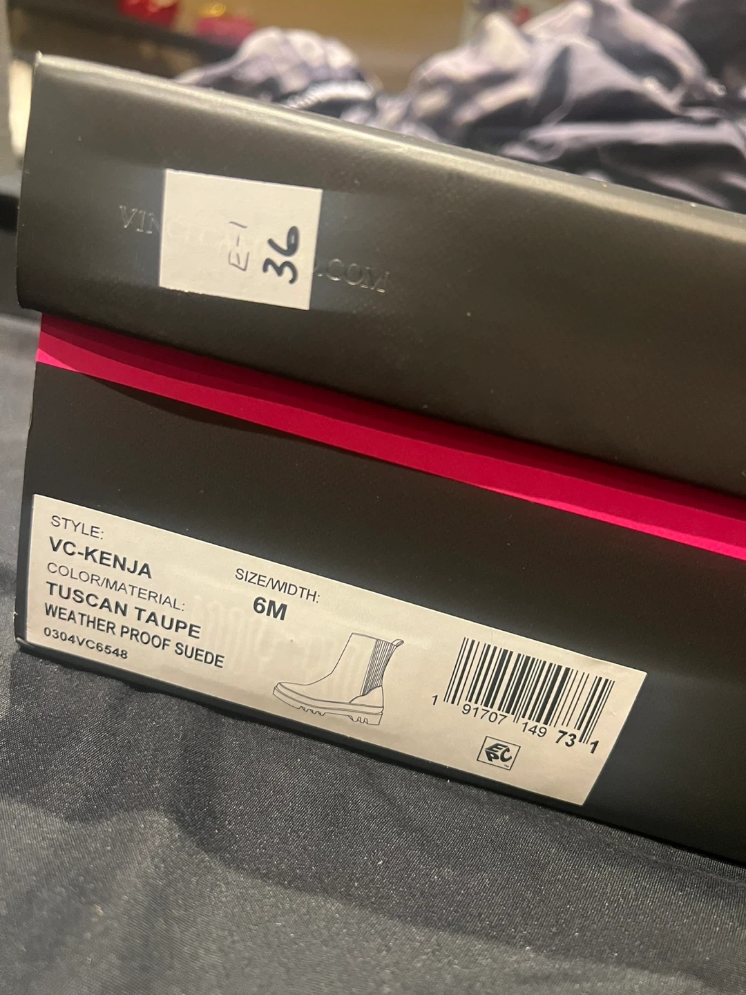 These Vince Camuto VC-KENJA boots are made with weather-proof suede in a Tuscan Taupe colour. They are size 6M and 7M and feature a side zipper. They're a stylish choice for wet weather!