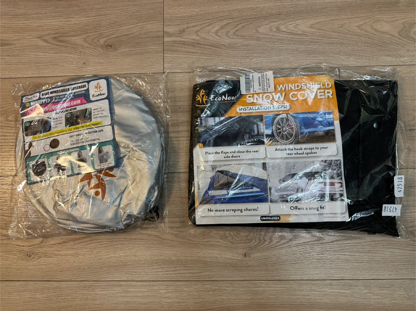 I'm selling a new EcoNour windshield sunshade and snow cover set! Both are still in their original packaging. The sunshade features easy installation with suction cups, and the snow cover has flaps and hook straps for a snug fit. No more scraping chores!