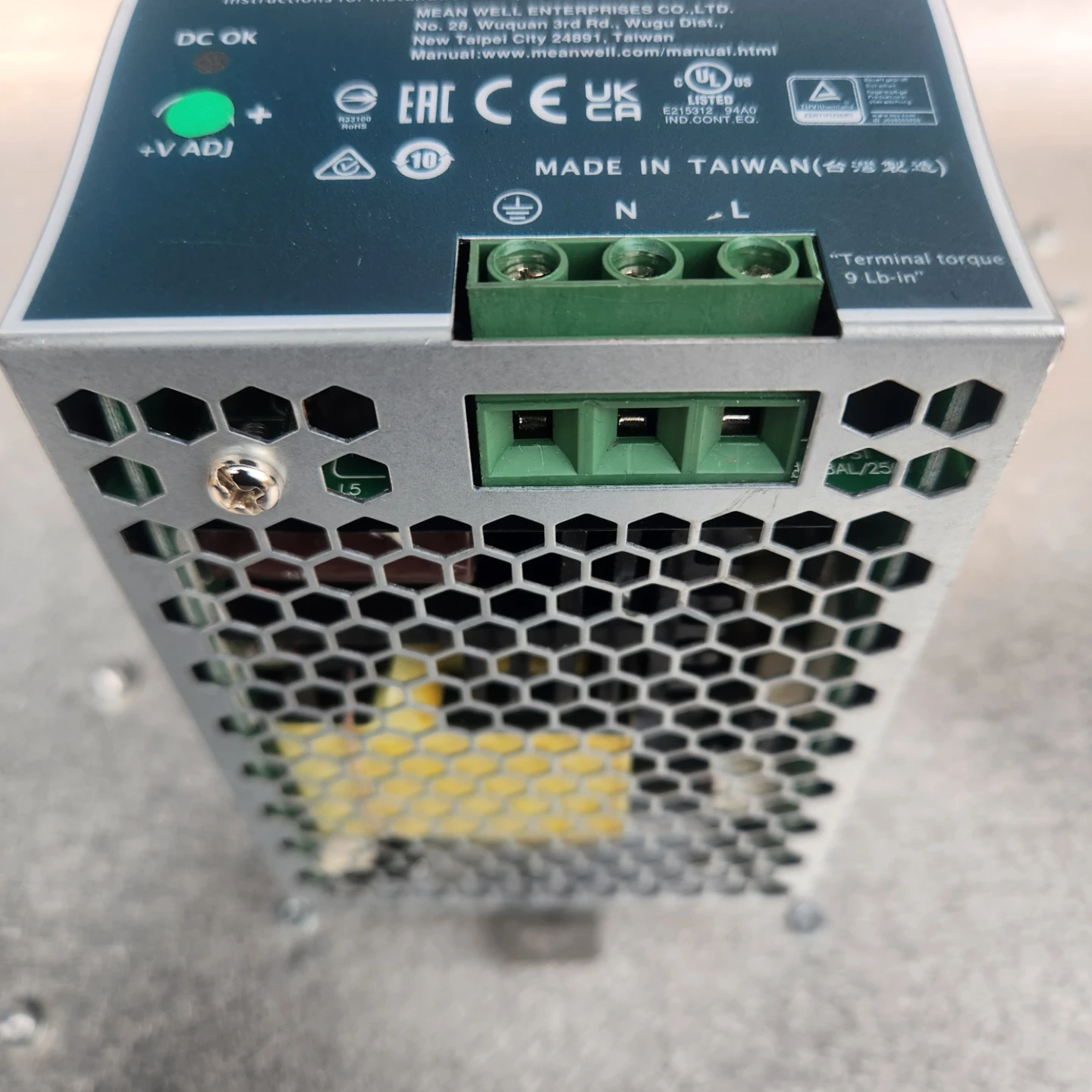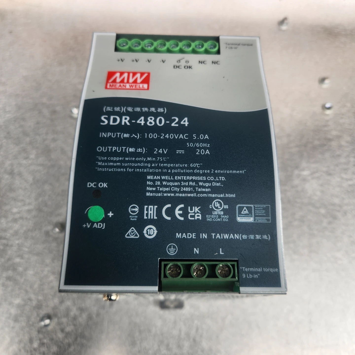 This is a Mean Well SDR-480-24 power supply. Input is 100-240VAC 5.0A and output is 24V 20A. Maximum surrounding air temperature is 60°C. Made in Taiwan.